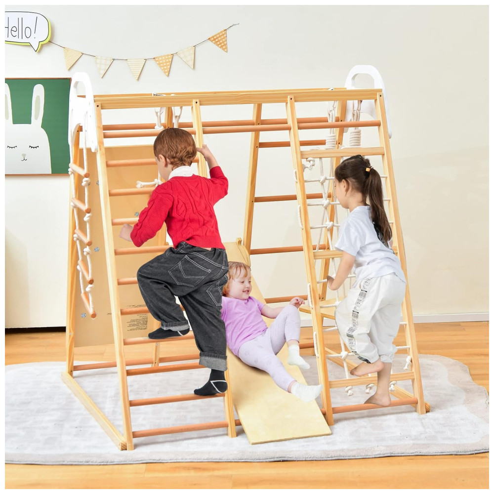 Playground GLACER Ginásio Indoor 8 em 1 Trepa-Trepa de Madeira com Escorregador Balanço Barras de Macaco Escada de Corda Rocha de Escalada.
