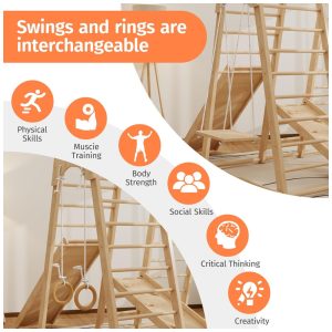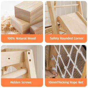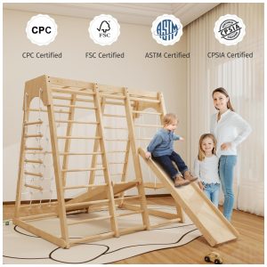 Transforme um cantinho da sua casa em um playground divertido com o Jungle Gym Montessori da LunaQuest! Este conjunto 8 em 1 oferece diversão garantida, com balanços, escorregador, escada, rede de escalada, barras de macaco e muito mais. Feito de madeira 100% natural, este playground é seguro e certificado pela CPC ASTM CPSC. Promove o desenvolvimento motor das crianças, equilíbrio, coordenação e resistência. Resistente e estável, suporta até 90 kg por seção de escalada. Fácil de montar e desmontar, perfeito para uso em casa ou pré-escolar.