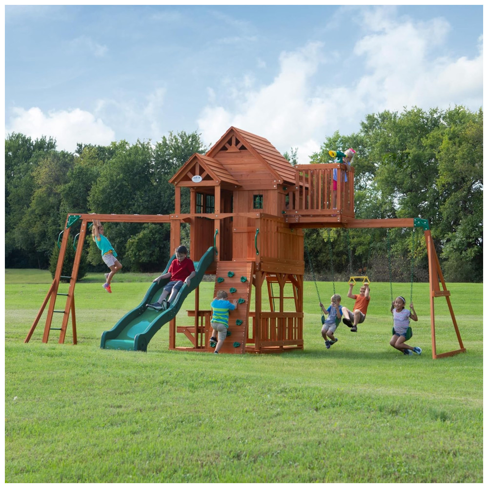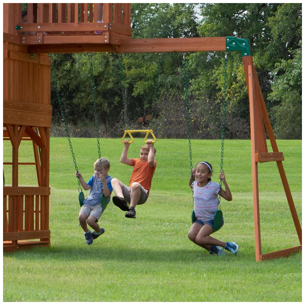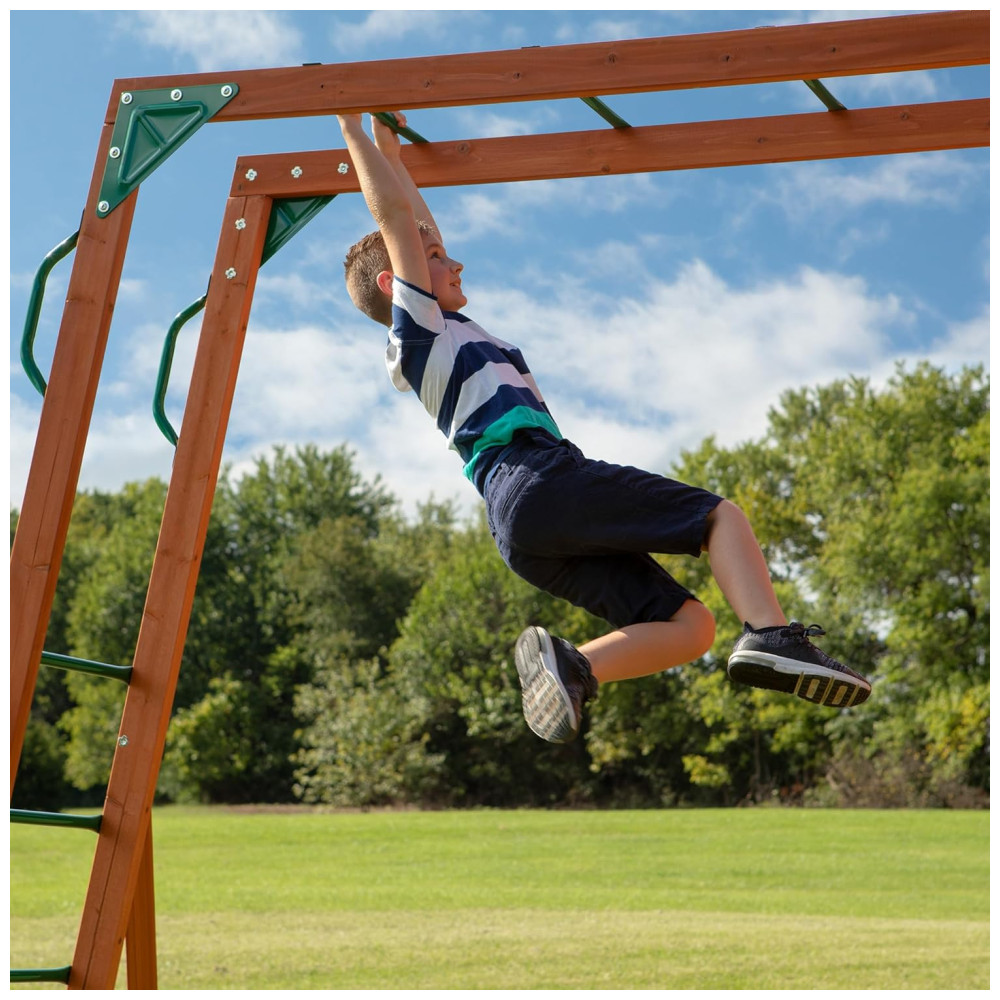 Barras de Macaco, Escorregadores e Outros Recursos: Este conjunto de balanços de madeira oferece uma grande variedade de tamanhos, recursos e estilos, transformando qualquer quintal em um playground cheio de desafios e diversão, que vai entreter as crianças por horas.