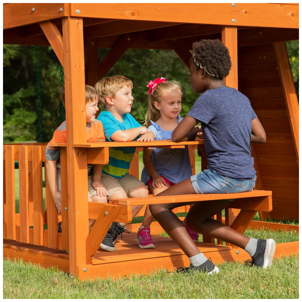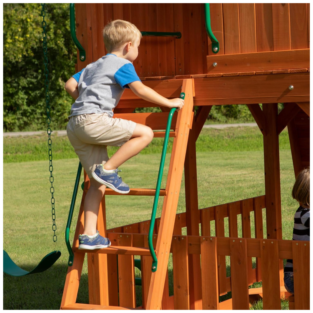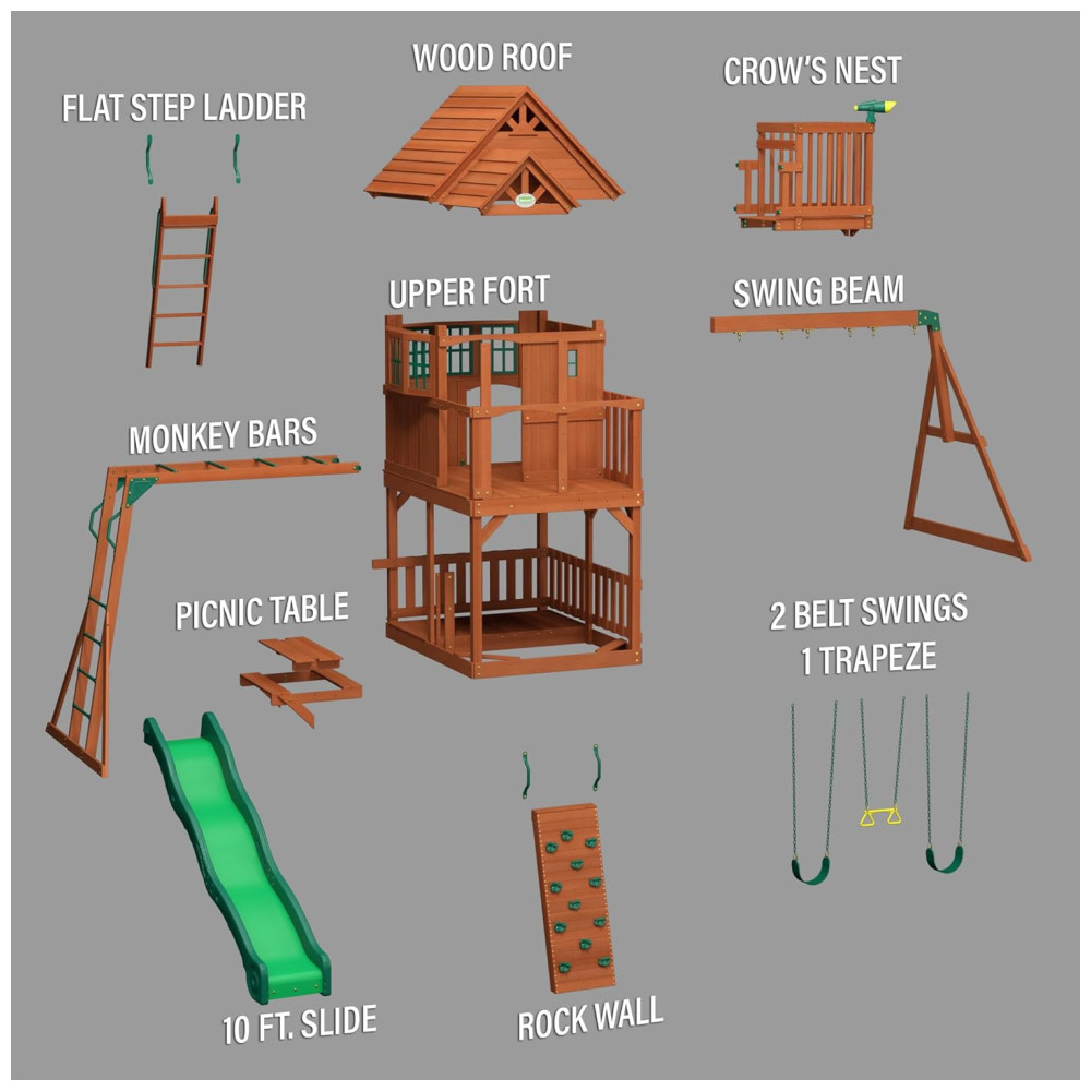 Do ninho do corvo, as crianças terão uma vista privilegiada do horizonte e poderão lançar suas aventuras. Após, elas correrão para as barras de macaco e balanços, localizados na viga de balanço de três posições, que oferecem muita diversão. A parede de escalada sólida e a escada padrão garantem um desafio saudável e divertido, enquanto o escorregador de ondas de 305 cm (10 pés) proporciona uma descida rápida e emocionante, que as crianças vão adorar repetir.