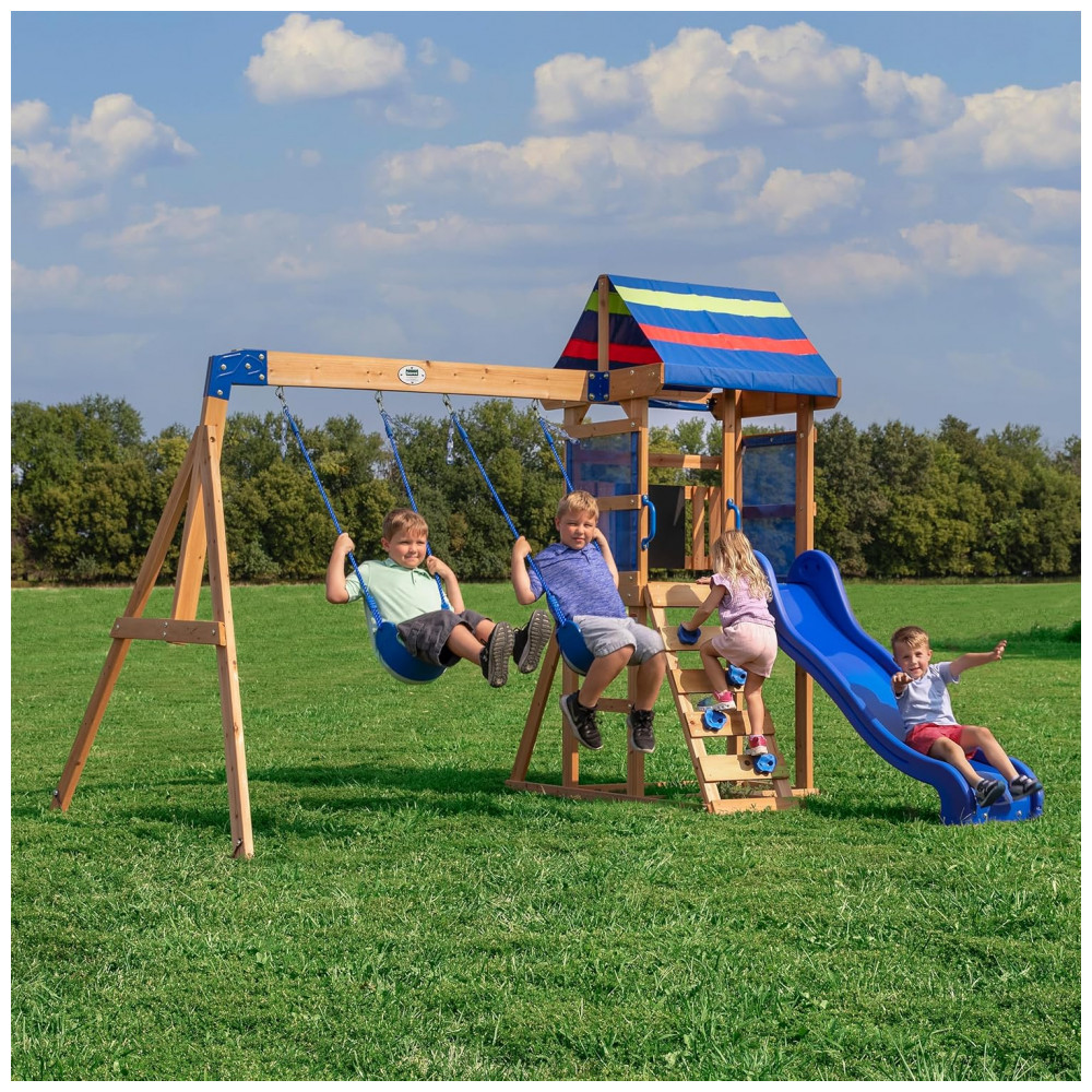 Playground Infantil de Madeira com Caixa de Areia Parede de Escalada Escorregador e 2 Balanços Backyard Discovery Azul