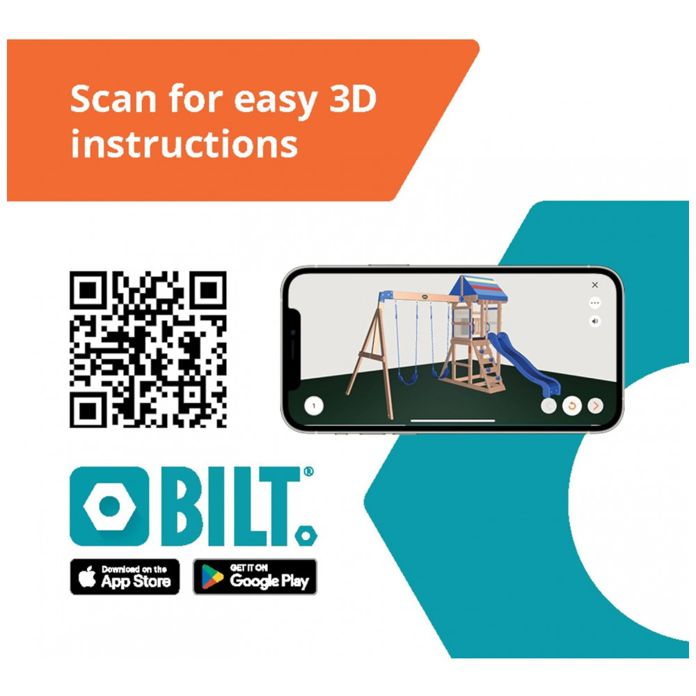 O deck coberto de 1,22 metros (4 pés) do Bay Pointe vem com um dossel colorido e painéis de proteção de malha, criando um ótimo espaço para uma pausa e para brincar à sombra. O deck é também o local perfeito para trabalhar a coordenação olho-mão-pé na escada de parede de pedra, que desafia os pequenos a escalar com segurança enquanto se divertem.