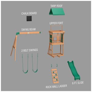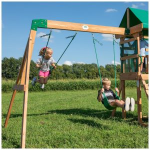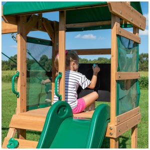 Desenvolvido especialmente para crianças menores, o Bay Pointe inclui um quadro-negro para brincadeiras criativas e correntes de corda nos balanços, garantindo segurança extra e evitando que os dedinhos se machuquem durante a diversão.