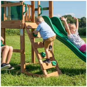 O deck coberto de 1,22 metros (4 pés) do Bay Pointe vem com um dossel colorido e painéis de proteção de malha, criando um ótimo espaço para uma pausa e para brincar à sombra. O deck é também o local perfeito para trabalhar a coordenação olho-mão-pé na escada de parede de pedra, que desafia os pequenos a escalar com segurança enquanto se divertem.