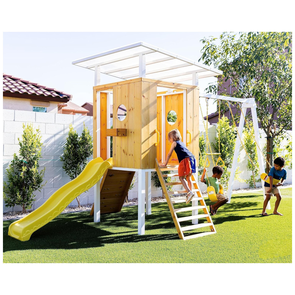 Playground Infantil de Madeira com Escorregador Balanços Escada e Parede de Escalada Avenlur SW001 Amarelo