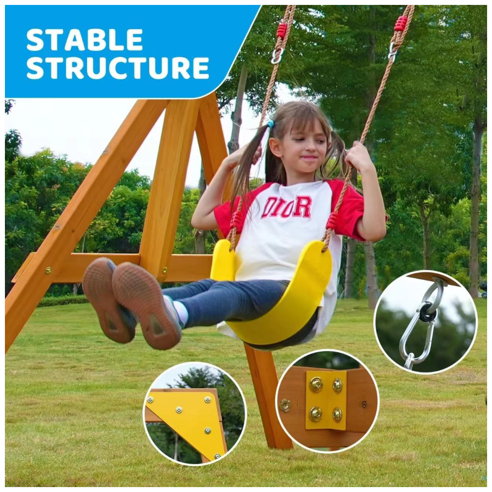 Assento de Balanço para Crianças: Nosso conjunto de brinquedos para áreas externas foi projetado com um assento de balanço especialmente seguro para crianças pequenas, eliminando qualquer preocupação com quedas. O assento vem com uma barra de segurança removível, permitindo que crianças de diferentes idades da mesma família aproveitem a diversão com total segurança.