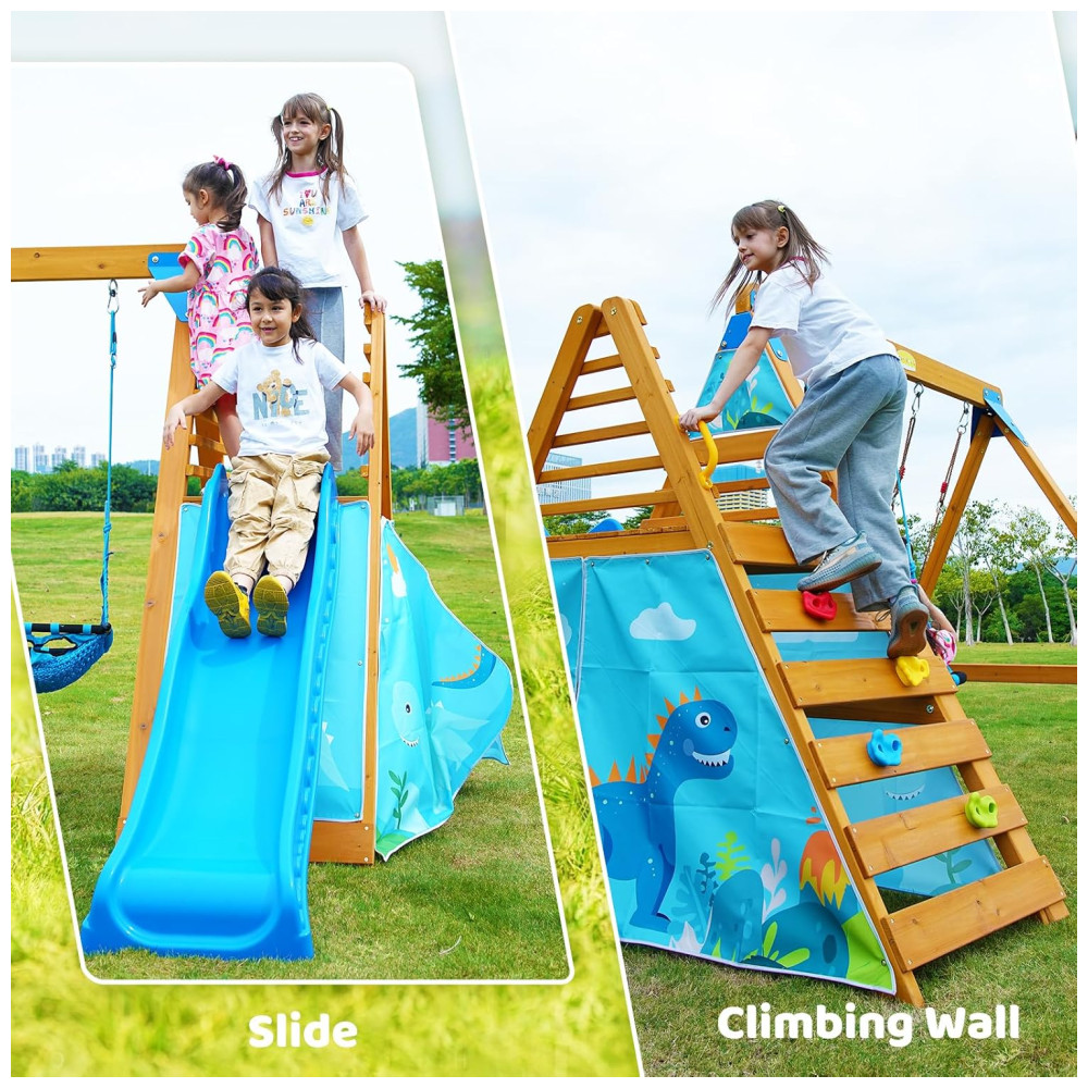 Playground Infantil de Madeira com Escorregador de Ondas 2 Balanços e Parede de Escalada SuniBoxi Amarelo e Azul