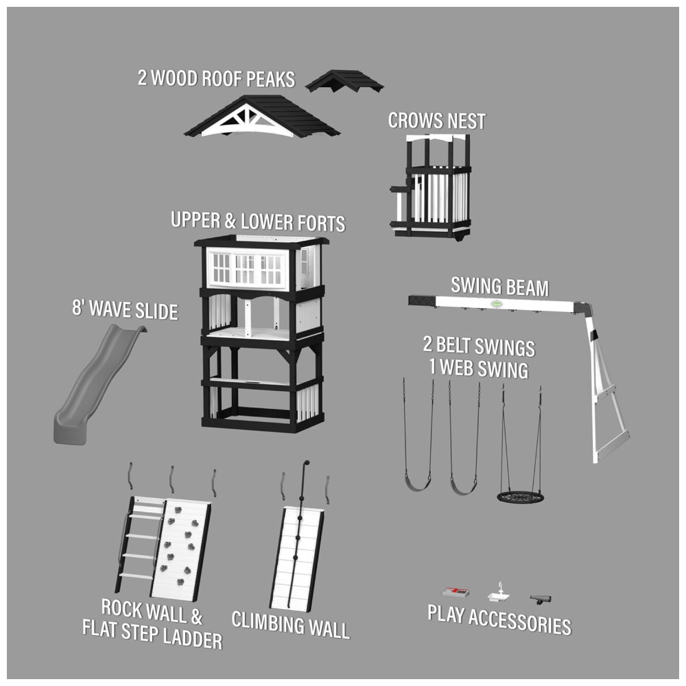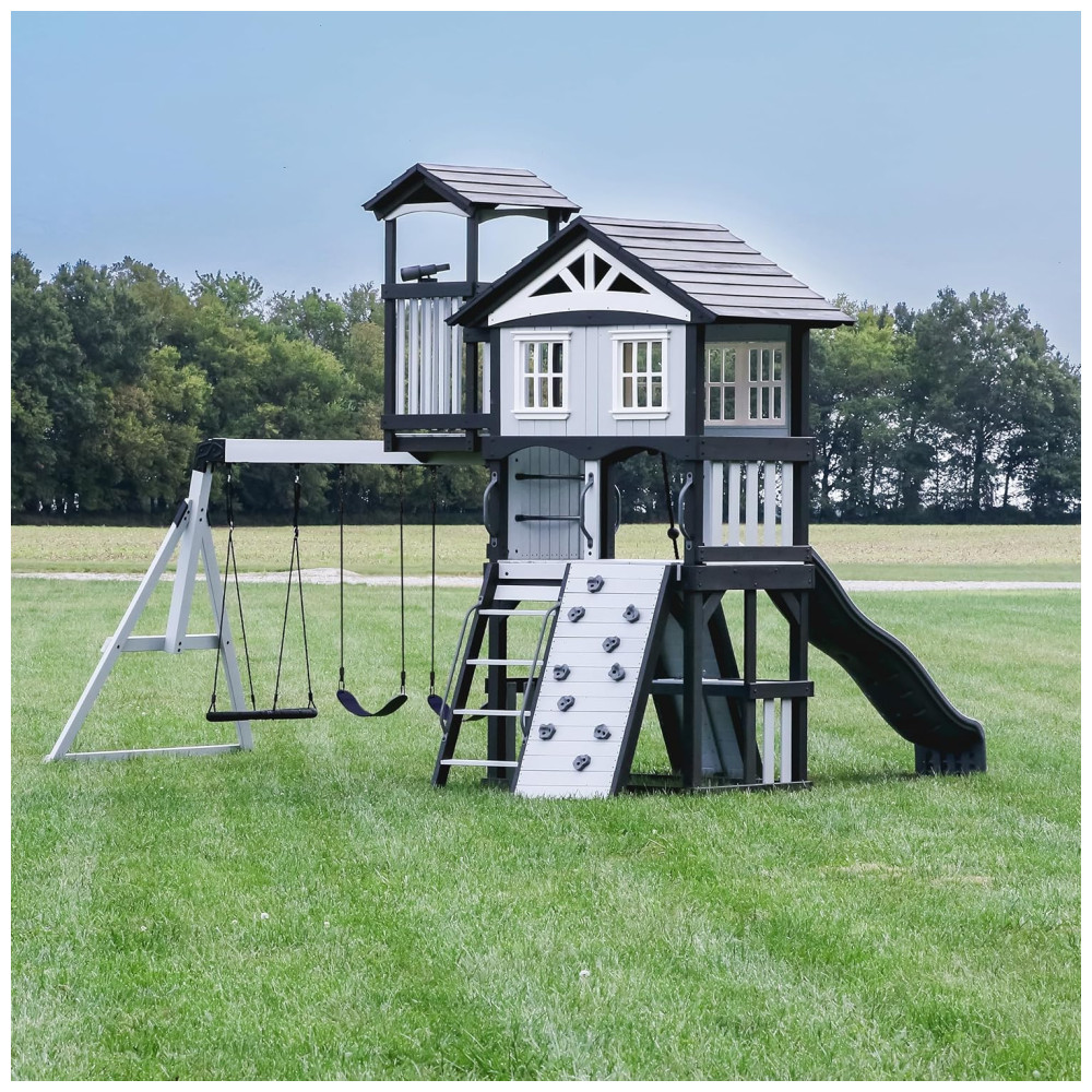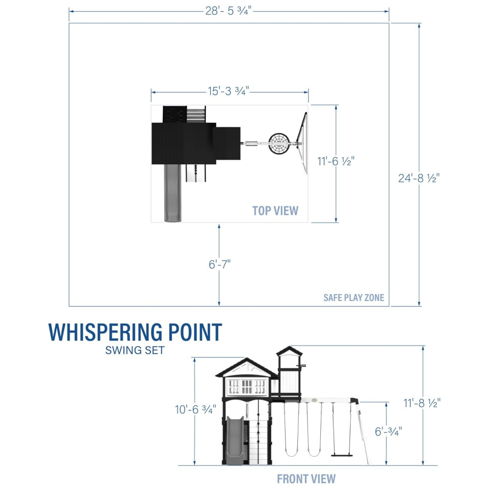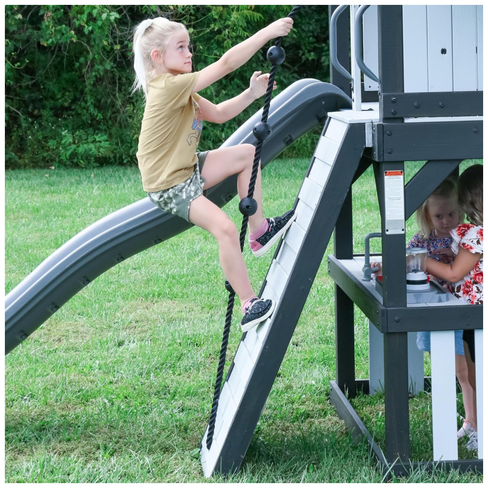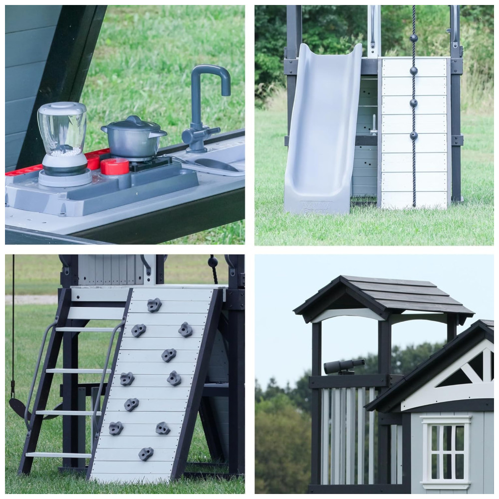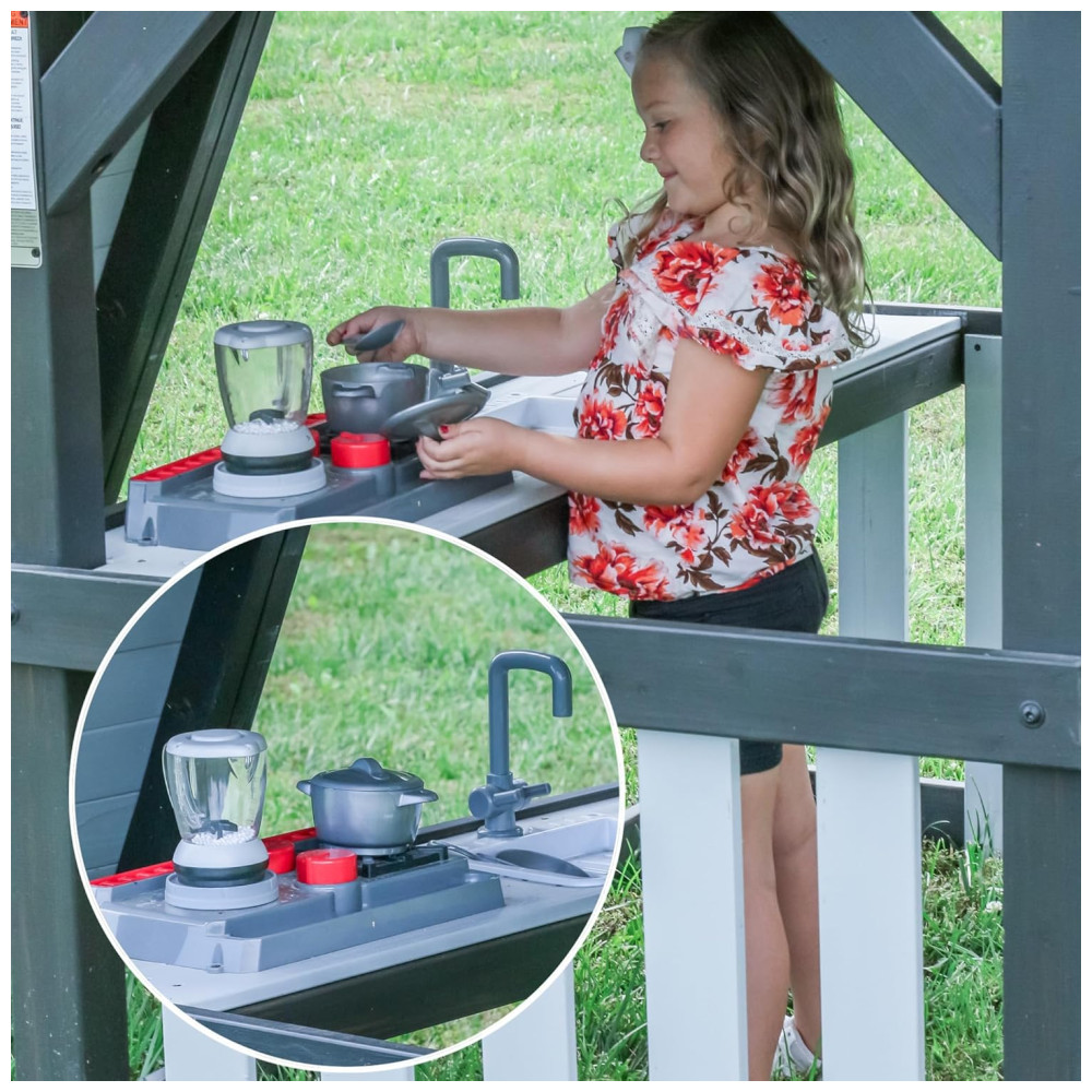 Whispering Point Swing Set – Criatividade Sem Limites: O conjunto de balanços Whispering Point é repleto de detalhes que estimulam a imaginação das crianças e as levam a novos patamares de diversão. Com um fogão, liquidificador a bateria, conjunto de panela e frigideira, pia e torneira, oferece horas de entretenimento criativo.