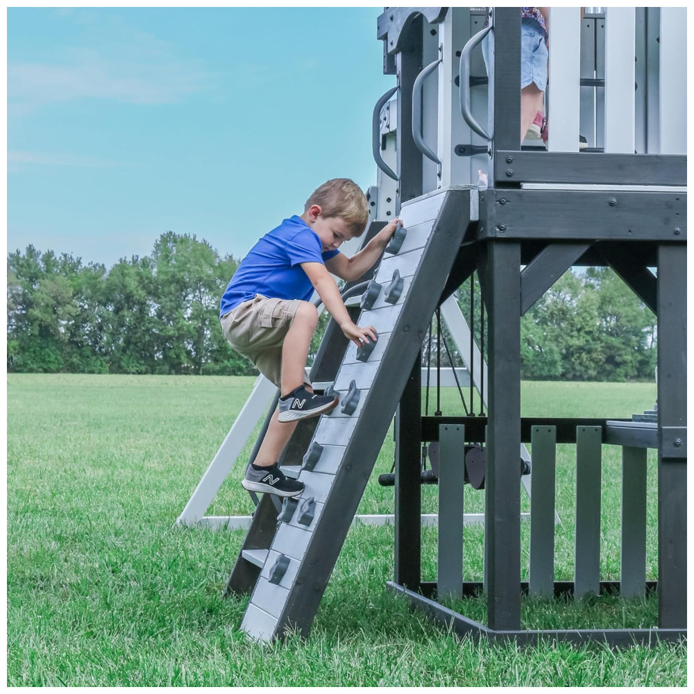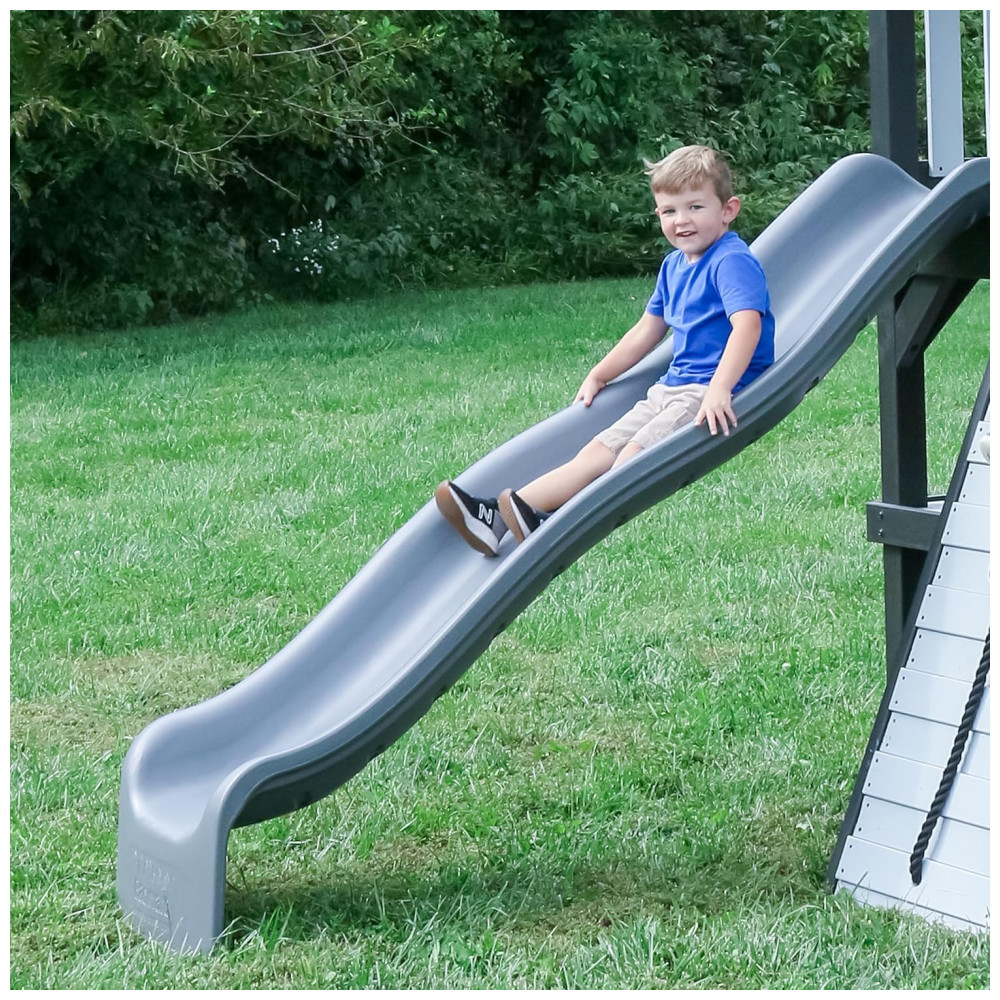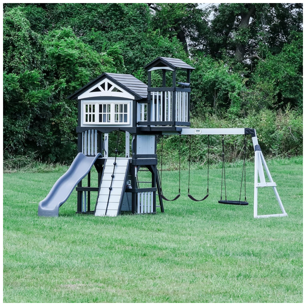 Playground Infantil de Madeira com Escorregador de Ondas Balanço de Teia Parede de Escalada e 2 Balanços de Cinto Backyard Discovery Cinza