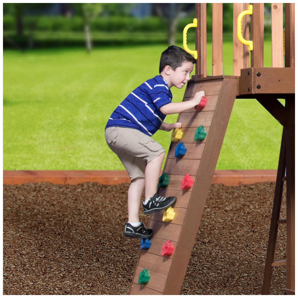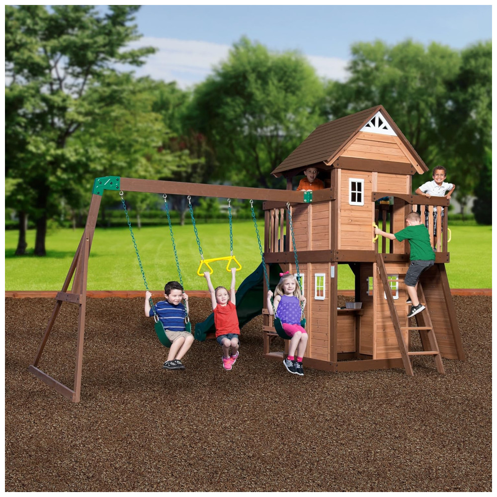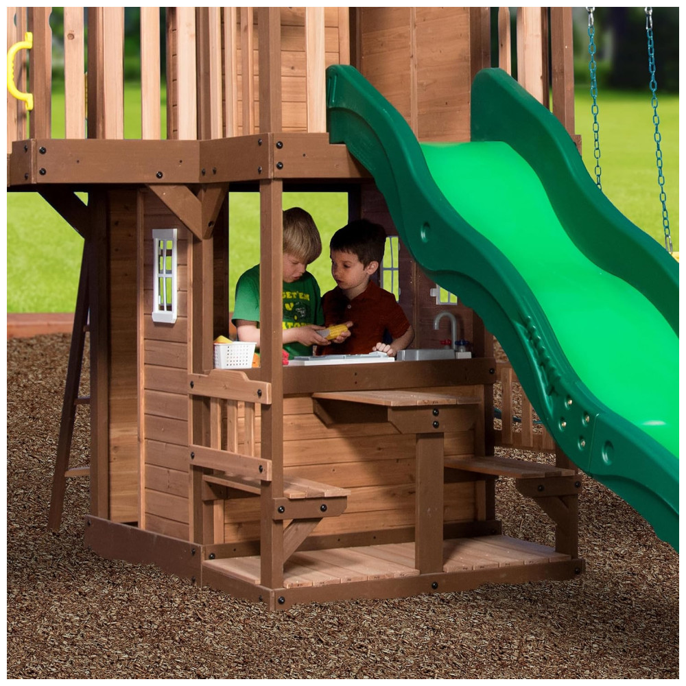Playground Infantil de Madeira com Mesa de Pequinique Parede de Escalada Escorregador 2 Balanços e Barra de Acrobacia Backyard Discovery Verde