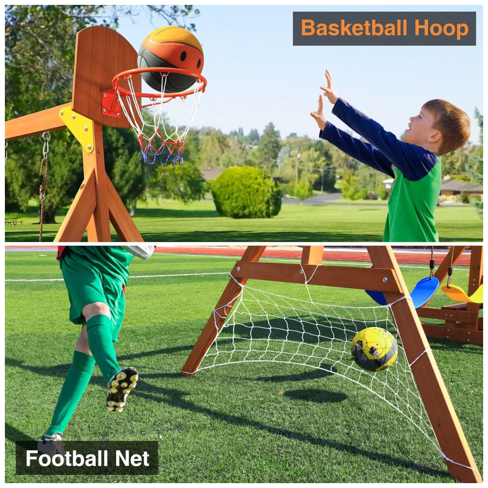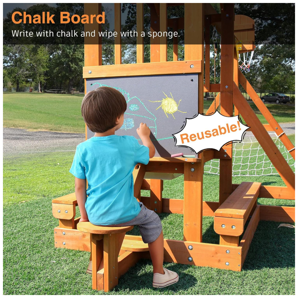 Conjunto de Balanço para Quintal – Diversão, Imaginação e Exercício: Nosso conjunto de balanço para quintal é a combinação perfeita de diversão, imaginação e exercício físico, indo muito além de um simples conjunto de brinquedos. Este conjunto multifuncional de madeira 6 em 1 inclui uma mesa de piquenique, prancheta de desenho, caixa de areia, balanço, cesta de basquete e área para futebol, proporcionando às crianças um espaço completo para brincar e se divertir o dia todo.