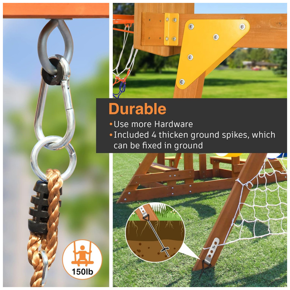 Durabilidade e Longa Vida Útil: Feito com madeira de abeto de alta qualidade e pintura à base de água ecologicamente correta, nosso conjunto é resistente à umidade e ao vento, ideal para uso externo. A tinta é não tóxica e não irritante, garantindo que as crianças possam brincar com segurança. O conjunto de brinquedos passou por diversas etapas de mistura de cores para escolher o tom que melhor transmite o calor do sol, trazendo um toque de cor vibrante e alegre para o seu quintal.