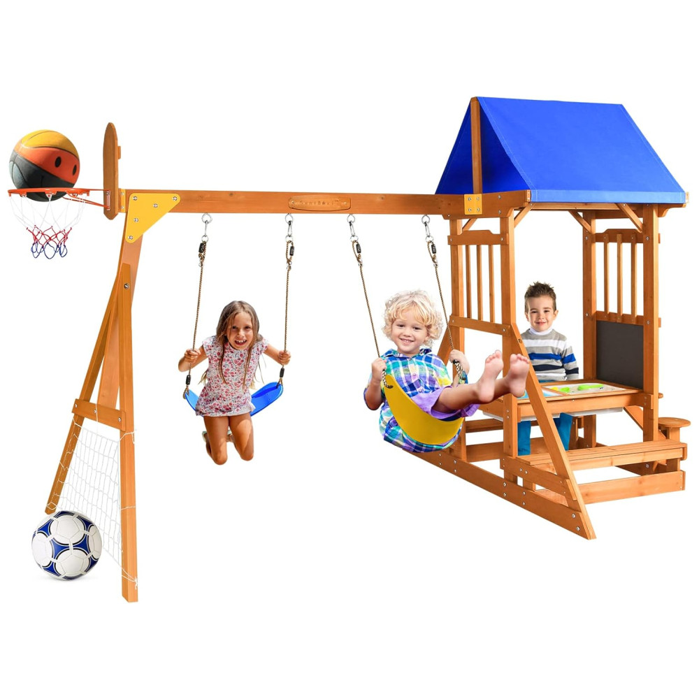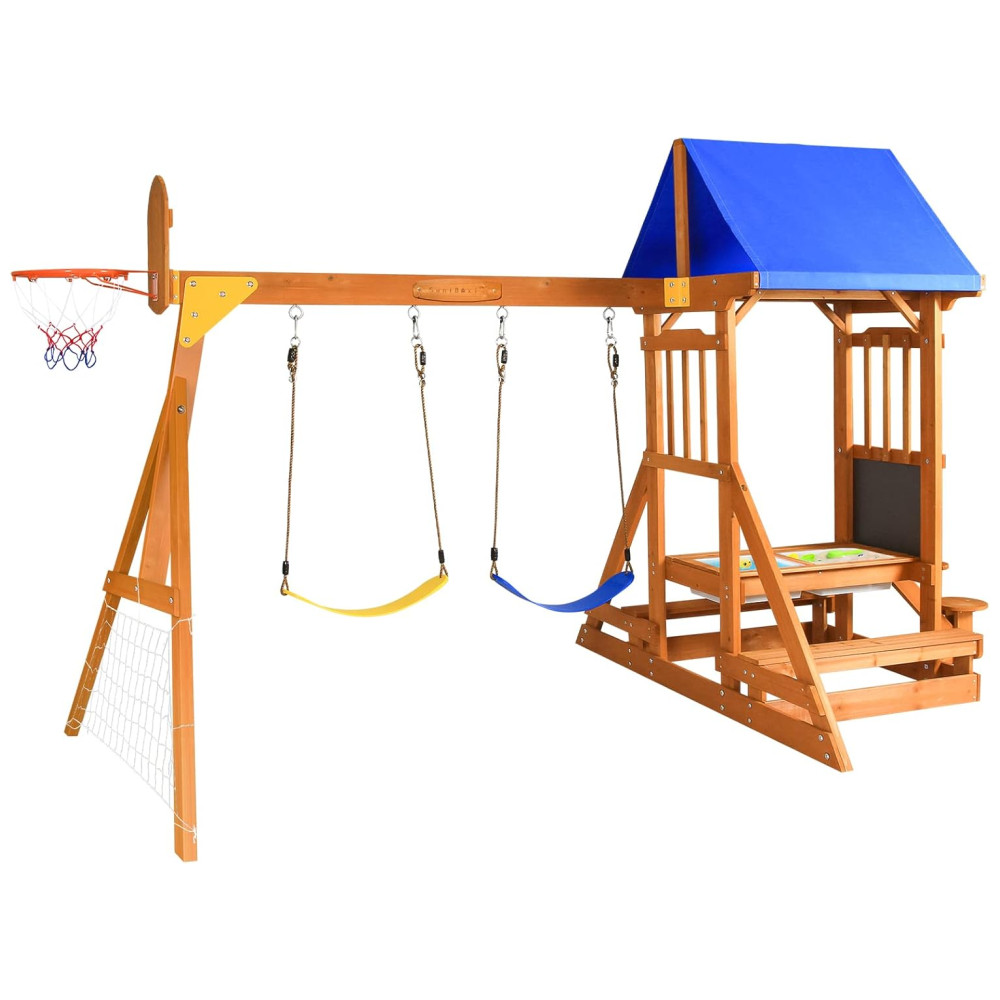 Playground Infantil de Madeira com Mesa de Piquenique Cesta de Basquete e 2 Balanços SuniBoxi Amarelo e Azul