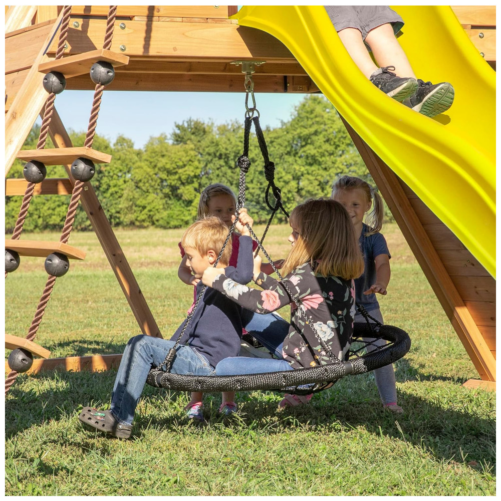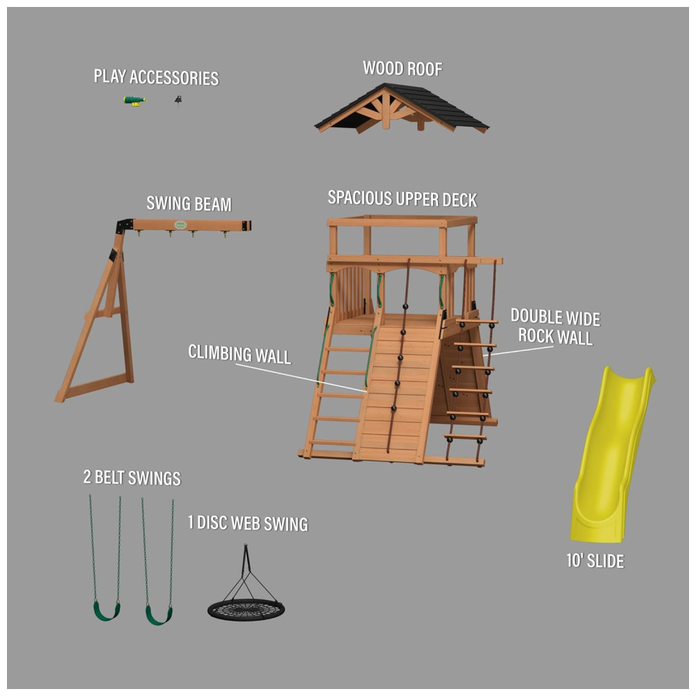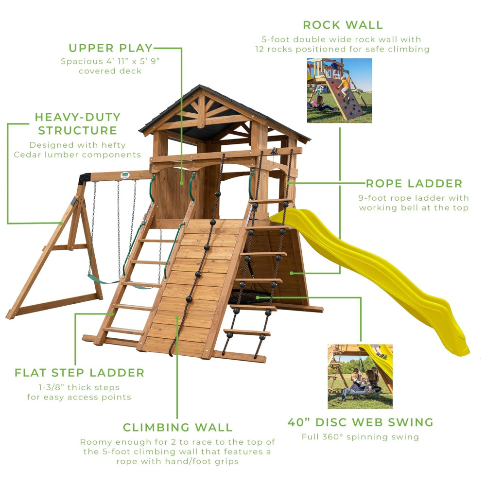 O balanço de disco de 1 metro (40 polegadas) e os dois balanços de cinto com correntes revestidas garantem diversão contínua e segura para as crianças. O Double Wide Rock Wall de 1,52 metros de altura é ideal para dois escaladores, tornando a brincadeira ainda mais social e emocionante.
