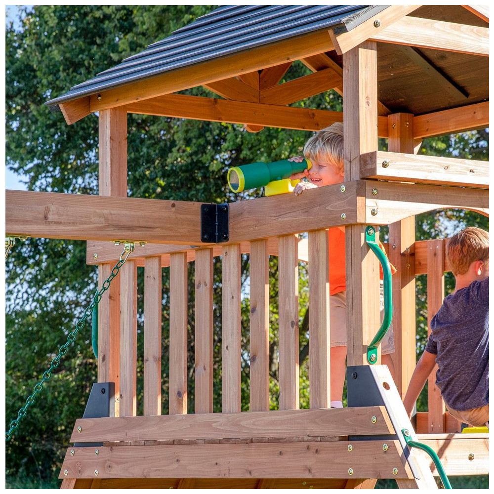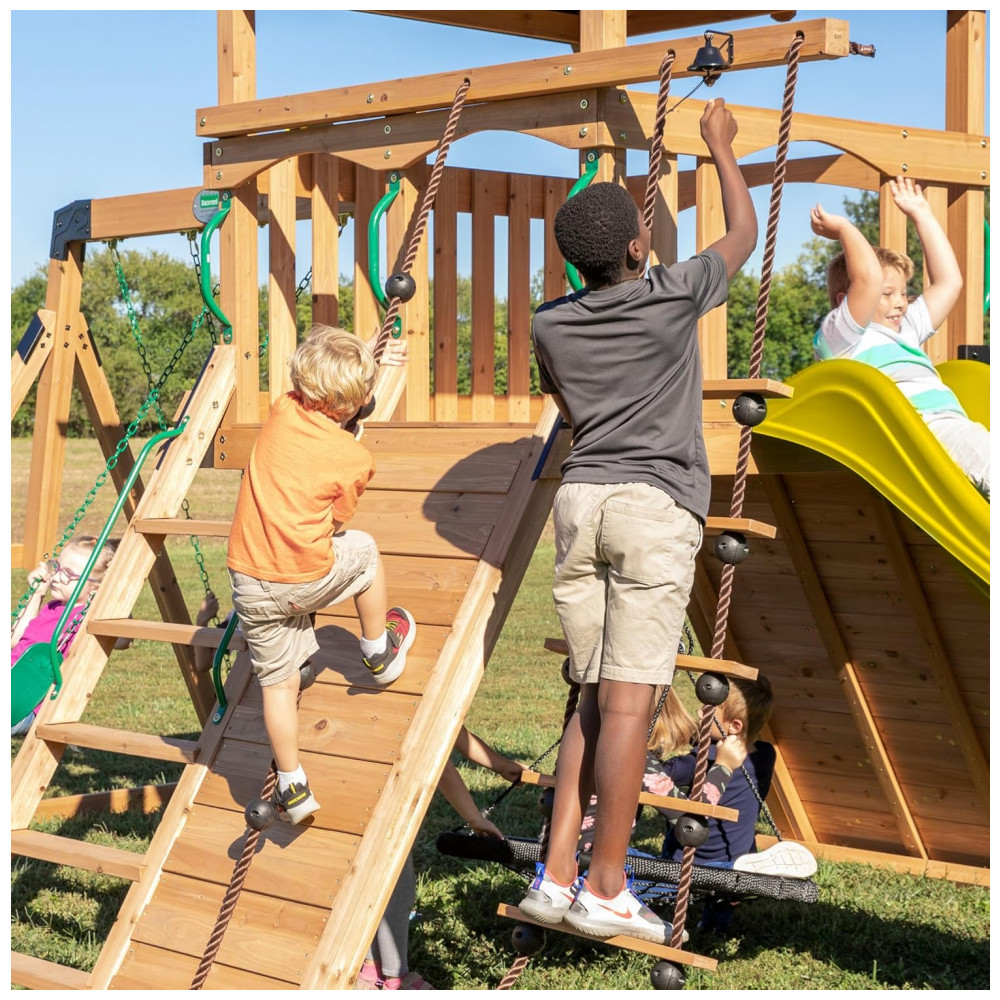 Com escadas planas de degraus largos e alças de segurança extra longas, este conjunto oferece fácil acesso para crianças de todas as idades. O Endeavor também é projetado com suportes de aço reforçados e atende aos padrões ASTM, garantindo máxima segurança durante a diversão.