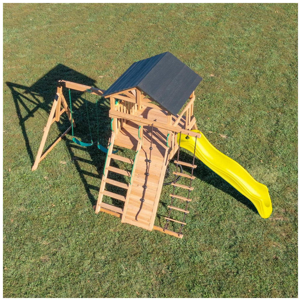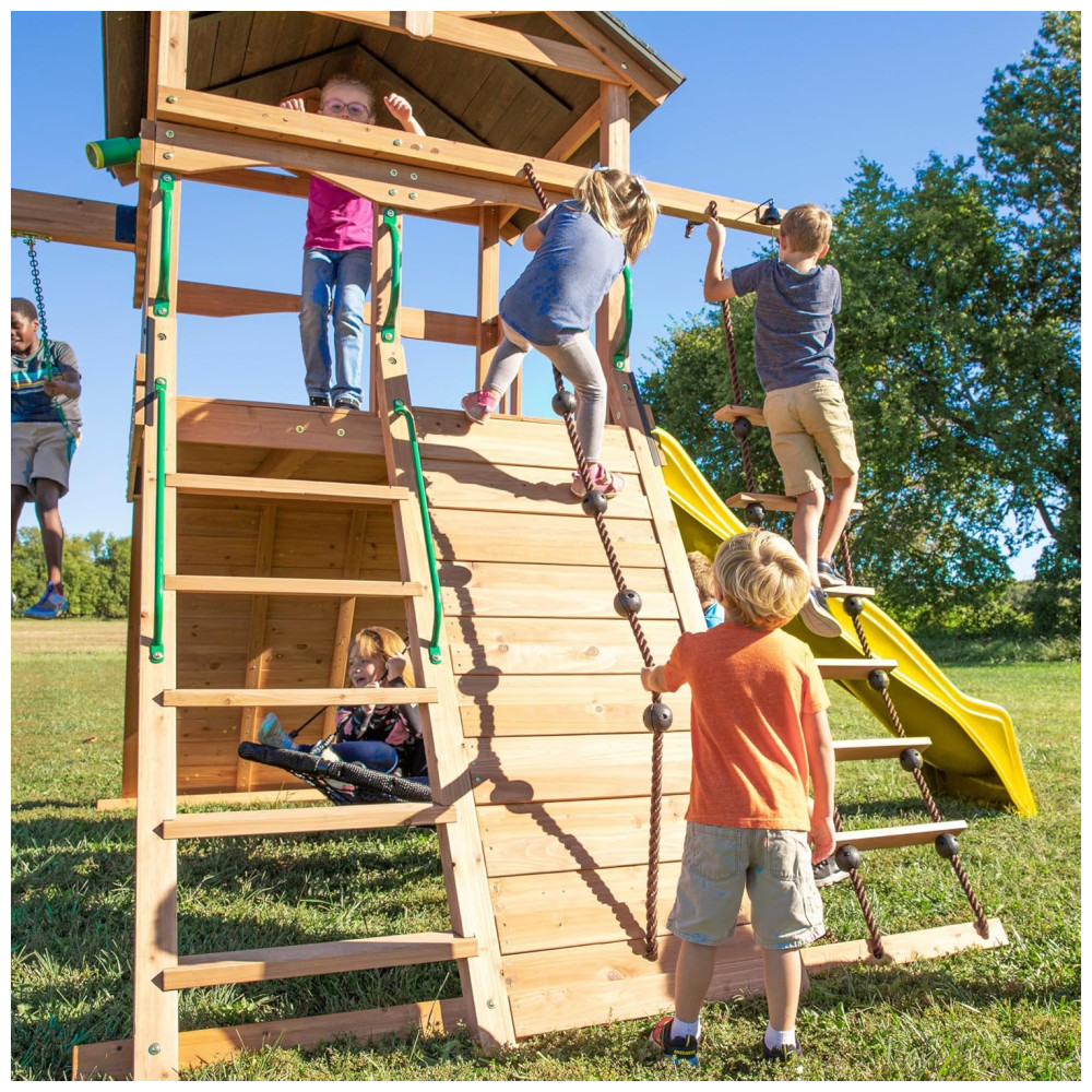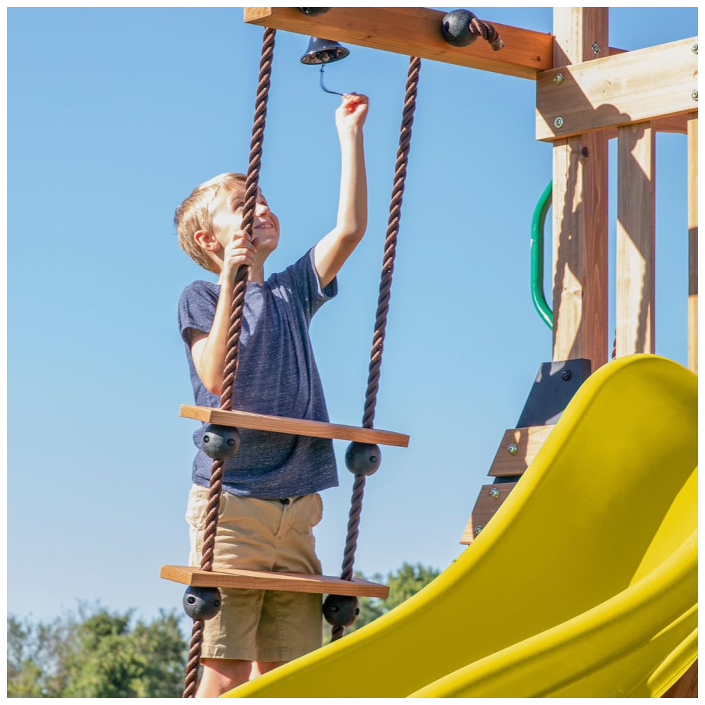 O escorregador de ondas de 3 metros (10 pés) com grades laterais altas proporciona uma descida rápida e segura, e a escada de corda de 2,75 metros oferece mais uma atividade divertida para melhorar a coordenação e a força, com o bônus de um sino funcional no topo.