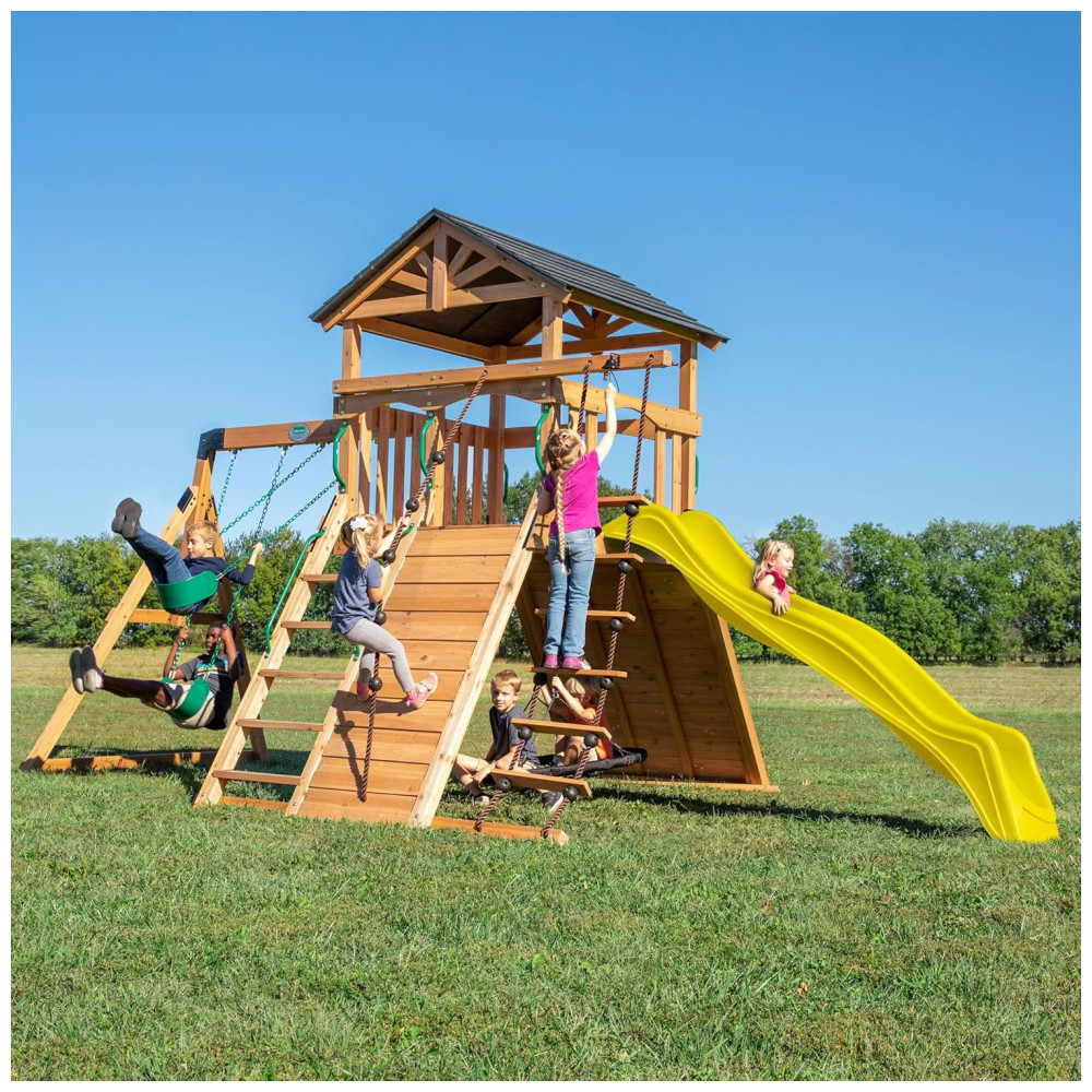 Playground Infantil de Madeira com Parede de Escalada Escorregador 2 Balanços de Cinto e 1 Balanço de Teia Backyard Discovery Amarelo