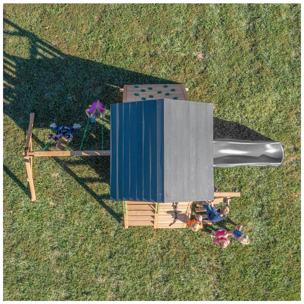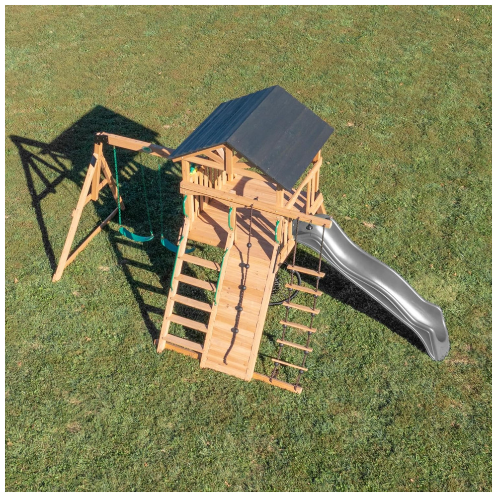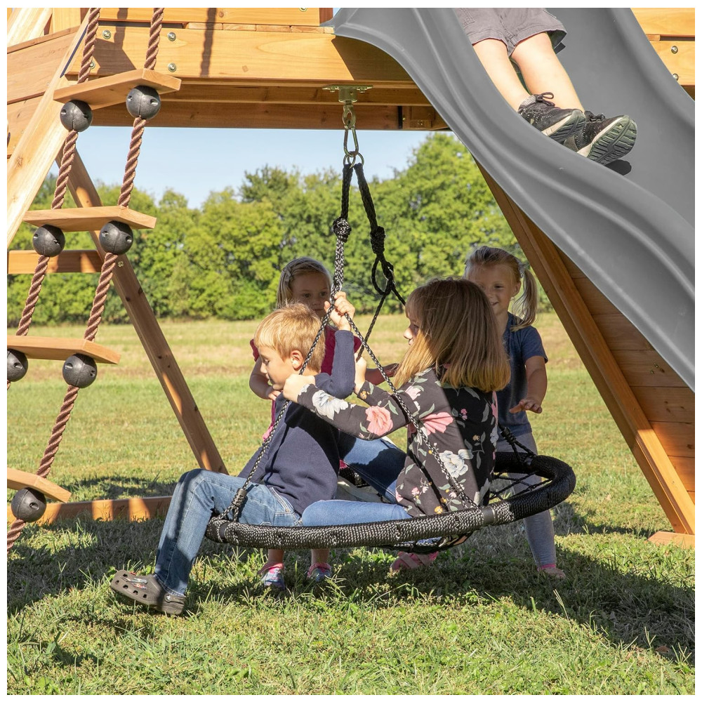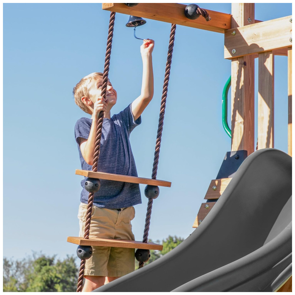 O escorregador de ondas de 3 metros (10 pés) com grades laterais altas proporciona uma descida rápida e segura, e a escada de corda de 2,75 metros oferece mais uma atividade divertida para melhorar a coordenação e a força, com o bônus de um sino funcional no topo.