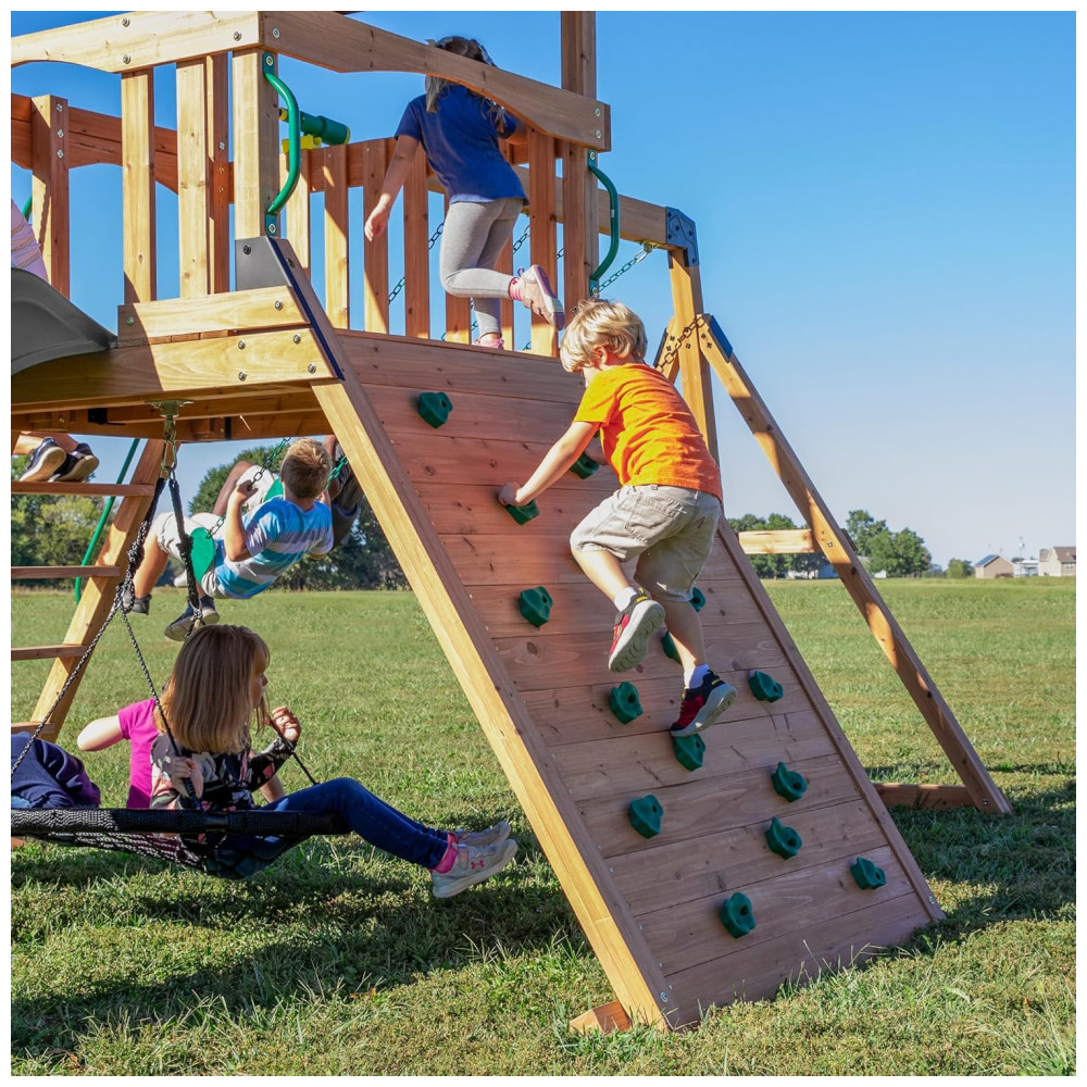 Com um deck coberto estilo casa na árvore de 1,52 metros x 1,75 metros, as crianças poderão explorar alturas, se envolver em brincadeiras imaginativas e até se esconder no alto. A parede de escalada de 1,5 metros de altura ajuda no desenvolvimento do equilíbrio e das habilidades motoras, enquanto as cordas com apoios para as mãos e pés tornam a escalada ainda mais divertida e desafiadora.