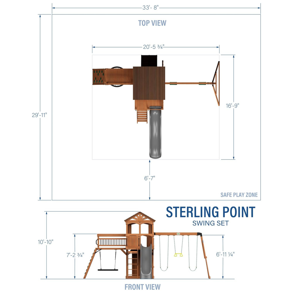 Depois de escalar a parede de pedra, as crianças podem se divertir descendo pelo escorregador de ondas de 10 pés/ 3 metros com grades laterais altas, que asseguram uma descida rápida e segura. Para mais diversão ao ar livre, o Endeavor oferece dois balanços de cinto e um trapézio, permitindo que até três crianças brinquem ao mesmo tempo.