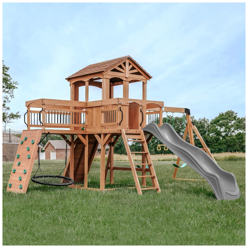 Playground Infantil de Madeira com Parede de Escalada Varanda Ponte Escorregador 2 Balanços de Cinto e 1 Balanço de Teia Backyard Discovery Cinza