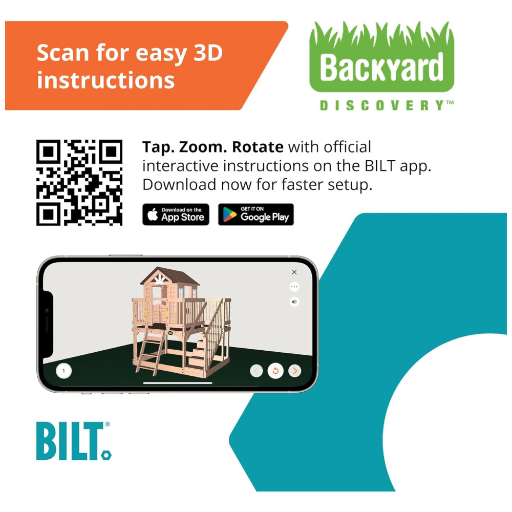 Fácil de montar com o auxílio do aplicativo interativo Bilt StepByStep. Este produto é recomendado apenas para uso residencial e atende aos mais altos padrões de segurança, cumprindo com as normas ASTM Código F114819.