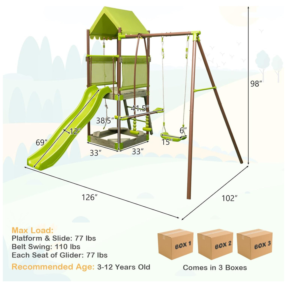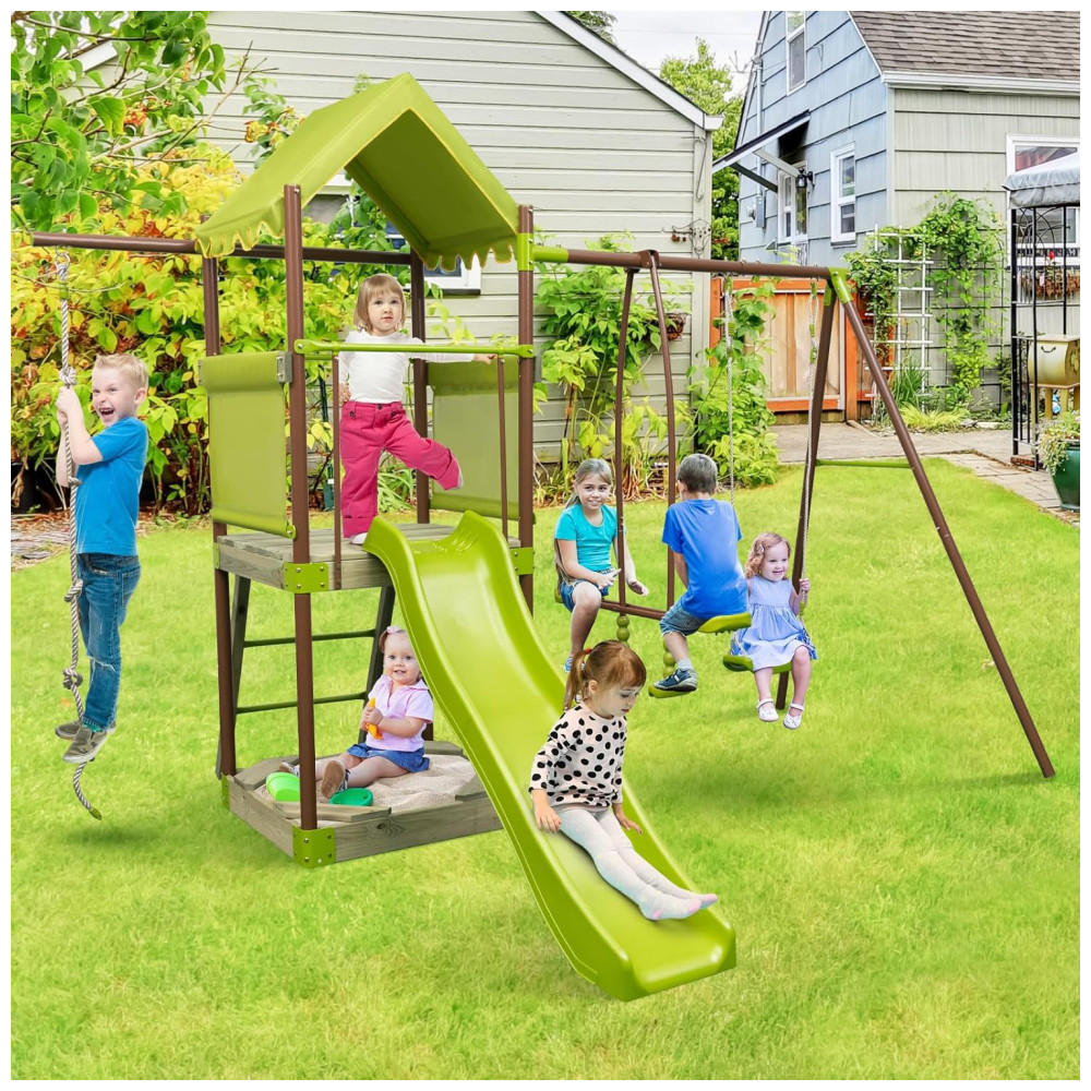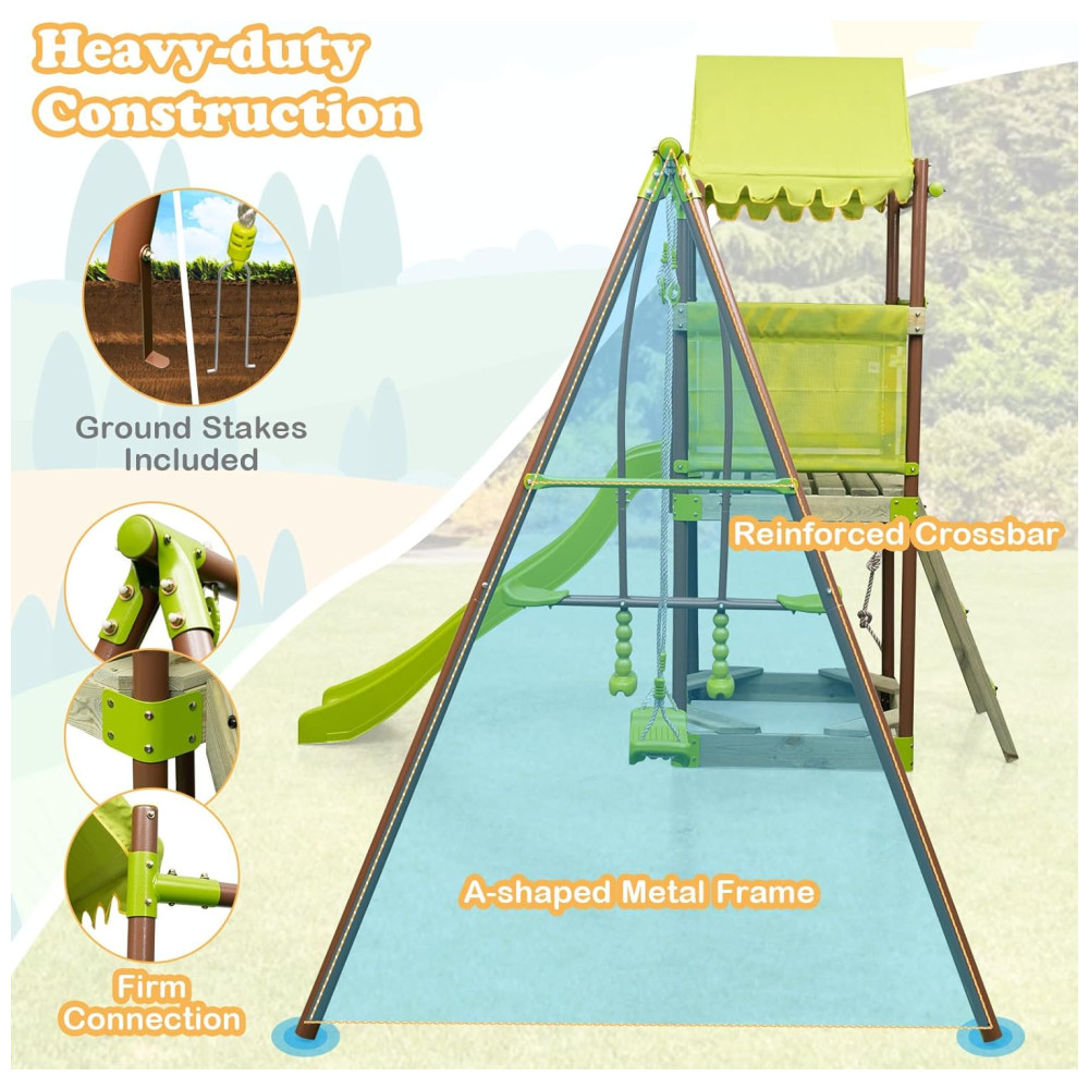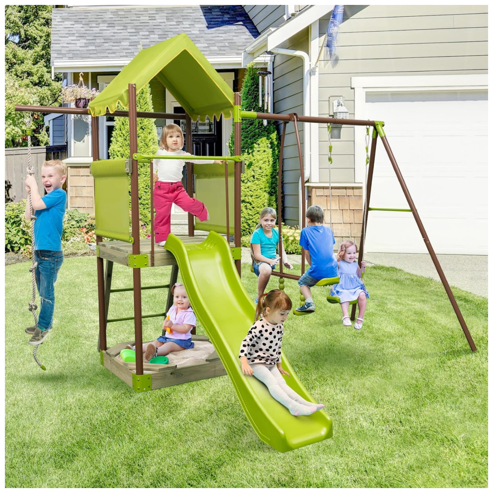 Playground Infantil de Metal com Corda de Escalada Caixa de Areia Planador para 2 Pessoas e Escorregador HONEY JOY Verde