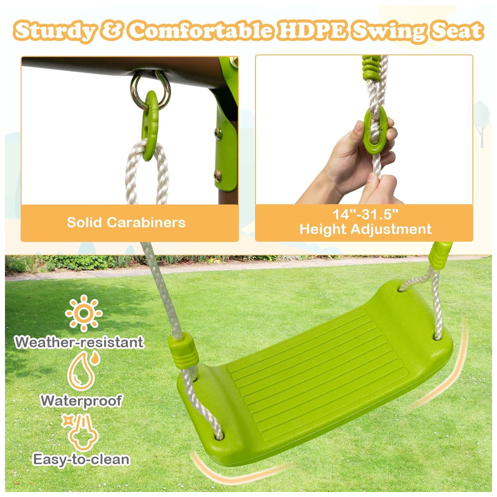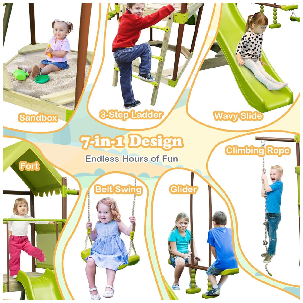 Experiência de Jogo 7 em 1 – Tudo Incluso: Transforme o quintal em um verdadeiro centro de diversão com o conjunto de balanços HONEY JOY 7 em 1! Este conjunto completo oferece um balanço de cinto, planador, escorregador emocionante, forte de dossel criativo, caixa de areia, corda de escalada desafiadora e escada prática. Ele proporciona uma combinação perfeita de brincadeiras físicas e imaginativas para entreter as crianças ao ar livre!
