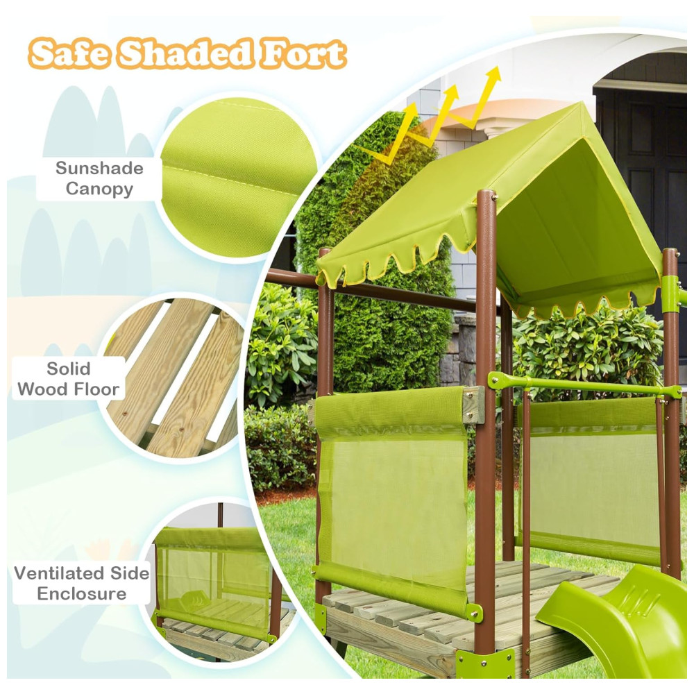 Características Amigáveis para Crianças: Este conjunto de brinquedos ao ar livre é construído com materiais de alta qualidade, incluindo metal, HDPE, madeira de cedro e tecidos seguros. Em conformidade com os padrões ASTM e CPSIA, ele garante a segurança das crianças durante a brincadeira, ao mesmo tempo em que oferece durabilidade e resistência.