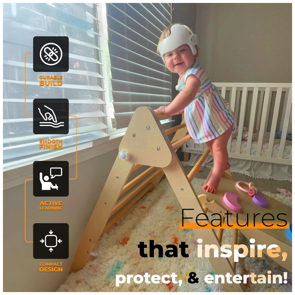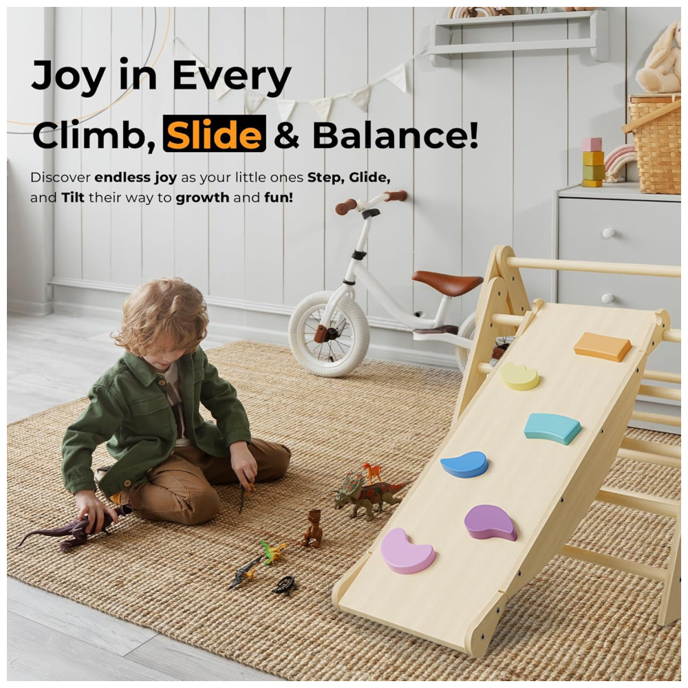 Com o LUCALUX Jungle Gym Infantil Indoor, as crianças exploram o mundo da escalada com segurança e diversão. Este playset de madeira inclui triângulo Pikler dobrável, escorregador reversível, parede de escalada, prancha de equilíbrio e gangorra. Proporciona uma experiência incrível de ginástica para crianças, tanto indoor quanto outdoor.