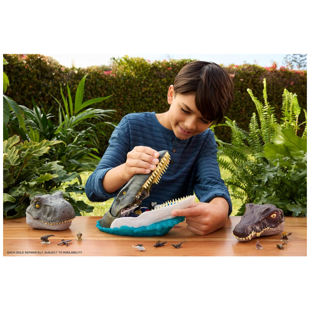 Quando fechado, o conjunto assume a forma de cabeça de Mosasaurus, facilitando o armazenamento das peças internas e o transporte para outros locais. O produto é recomendado para crianças a partir de 4 anos e faz parte da linha oficial Jurassic World Rebirth licenciada pela Mattel.