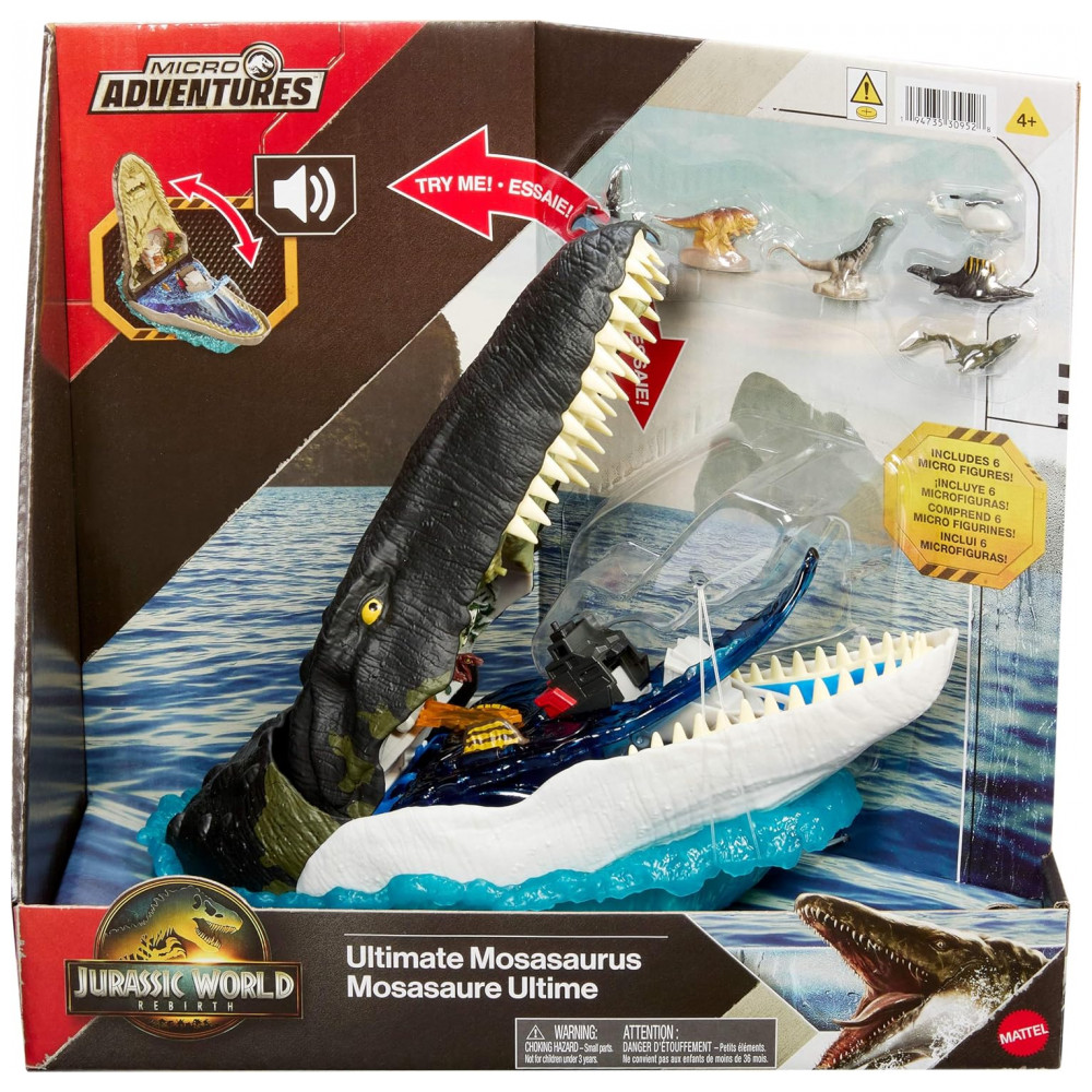 Conteúdo da embalagem: 1 playset Mosasaurus com som e partes móveis e 6 micro figuras