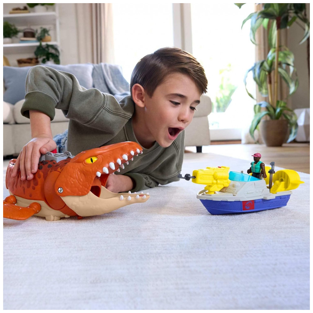 Playset dinossauro Fisher-Price Imaginext Jurassic World Rebirth Aquachomp Chase Mosasaurus 46 cm com som movimento barco e figura de ação