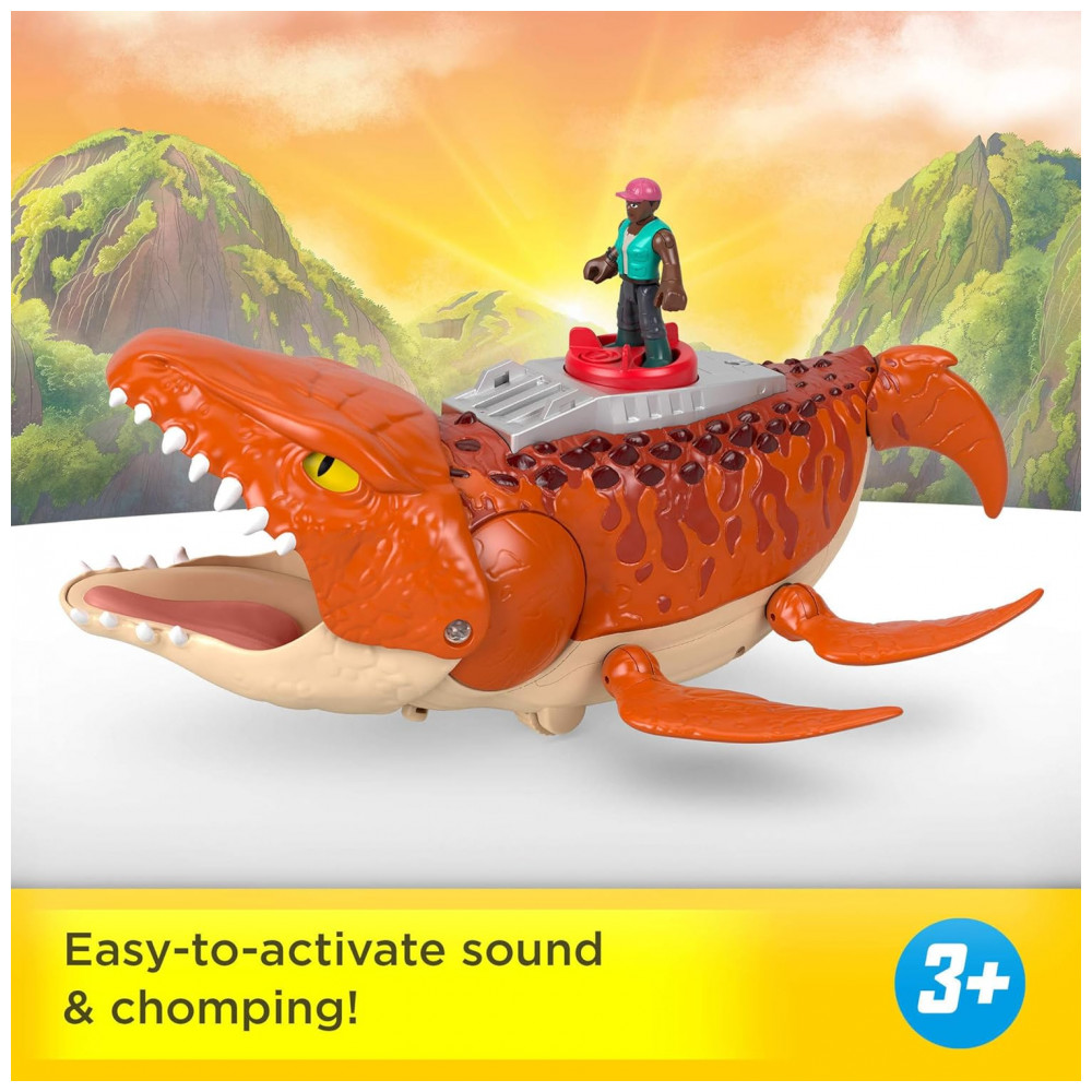 O playset Fisher-Price Imaginext Jurassic World Rebirth Aquachomp Chase Mosasaurus traz um grande Mosasaurus de aproximadamente 46 cm de comprimento, com rodas integradas, efeitos sonoros e movimento para brincadeiras de perseguição aquática. Ao pressionar o botão Power Pad nas costas do dinossauro, a mandíbula se move em ação de mordida enquanto são reproduzidos sons temáticos.