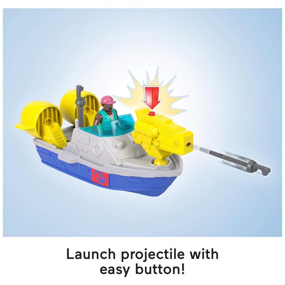 O conjunto acompanha uma figura de ação de 7,6 cm, um barco de patrulha com lançador removível e 2 projéteis, permitindo encenar capturas, fugas e resgates em torno do dinossauro. Indicado para crianças a partir de 3 anos, o playset é fabricado em plástico e utiliza pilhas para ativar os recursos eletrônicos de som.