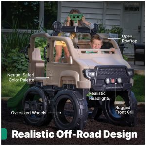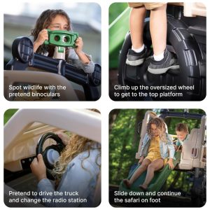 Brincadeira Divertida: Transforme seu quintal em um cenário de aventuras selvagens! As crianças podem “dirigir” usando o volante enquanto exploram com os binóculos para encontrar “animais”, estimulando a criatividade e o espírito aventureiro.