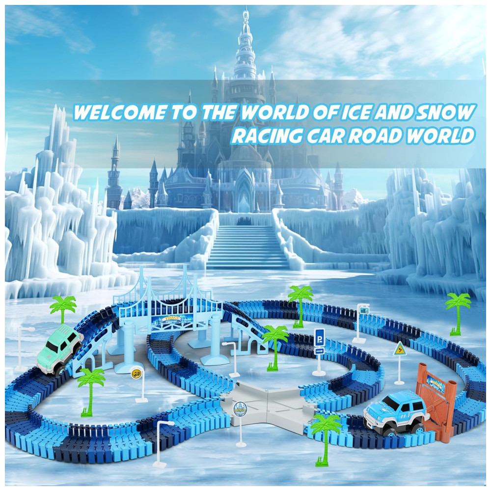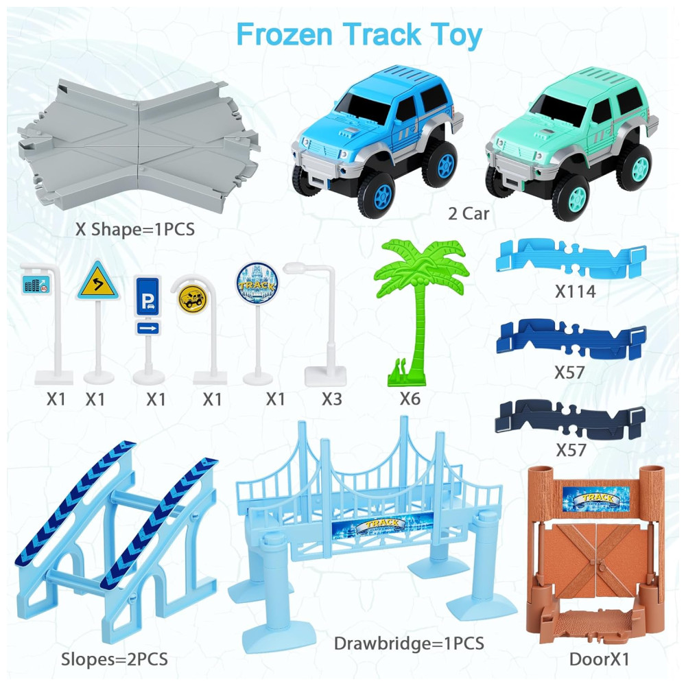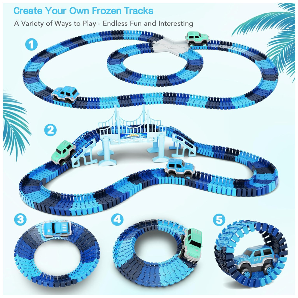 Pista de corrida flexível com 228 peças, incluindo 6 árvores, 2 carros de corrida, 1 porta, 1 ponte, 1 encruzilhada Xshape, 2 pistas e 8 placas de trânsito. Este conjunto permite criar trilhos de trem de fantasia exclusivos do mundo congelado, com muita flexibilidade para diferentes variações de layout. As peças dos trilhos são dinâmicas e podem girar para a esquerda ou para a direita. O carro de corrida requer bateria 1xAA não incluída e o conjunto vem com 2 carros de corrida, tornando o jogo mais interessante e atraente. É um bom brinquedo de interação para meninos e meninas, que ajuda a aprender a cooperar, exercitar a coordenação motora e a percepção das cores. Fácil de montar e desmontar para armazenar, este conjunto é seguro e não tóxico, de alta qualidade e durável, sendo a melhor escolha para presente de aniversário infantil ou presente de Natal. Acompanha caixa de embalagem colorida com tema Frozen.