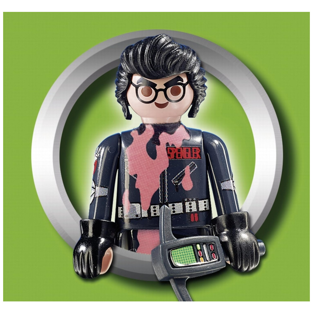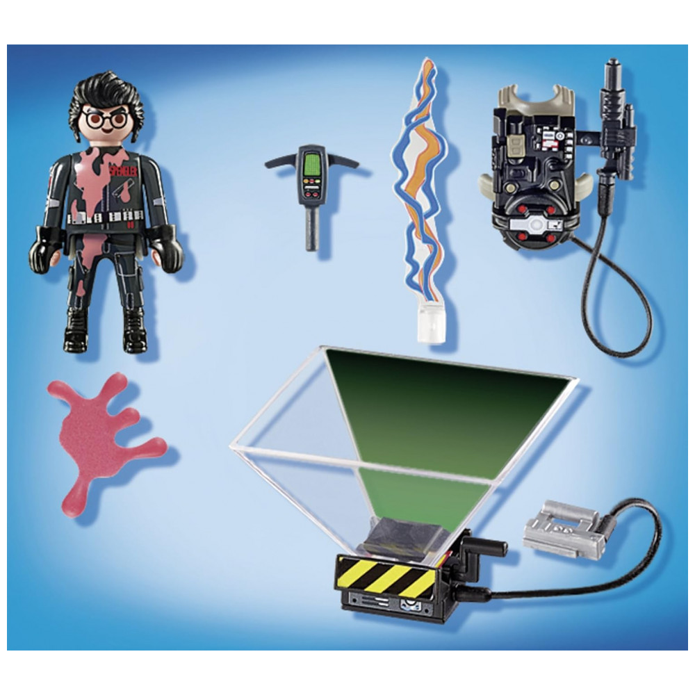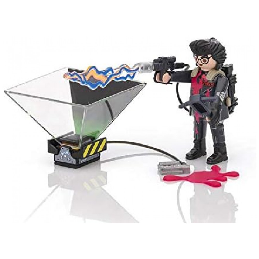 Playset temático Ghostbusters composto pela figura do personagem Egon Spengler e acessórios de captura de fantasmas, incluindo armadilha com cone holográfico transparente para simular a contenção do fantasma. A figura segue o padrão Playmobil, com articulações que permitem dobrar as pernas, sentar, ficar em pé e girar a cabeça.