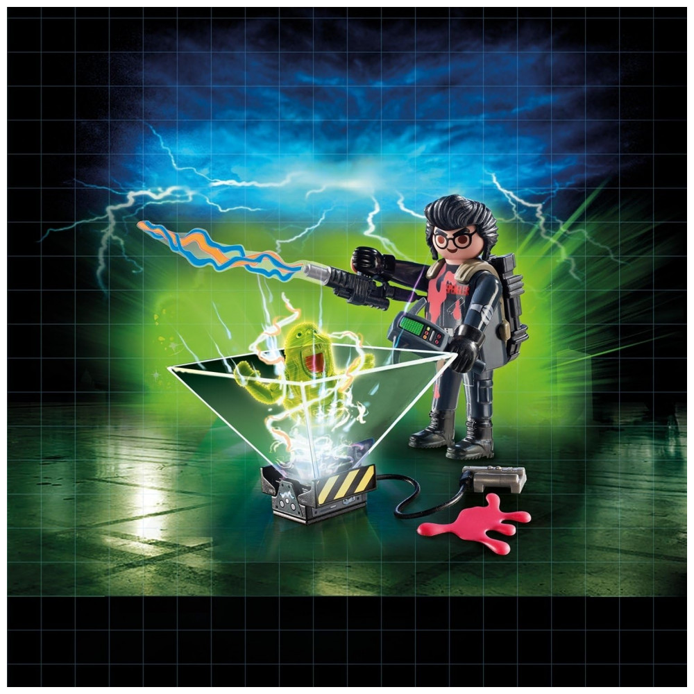 Playset Playmobil Ghostbusters Egon Spengler com armadilha de fantasma e cone holográfico