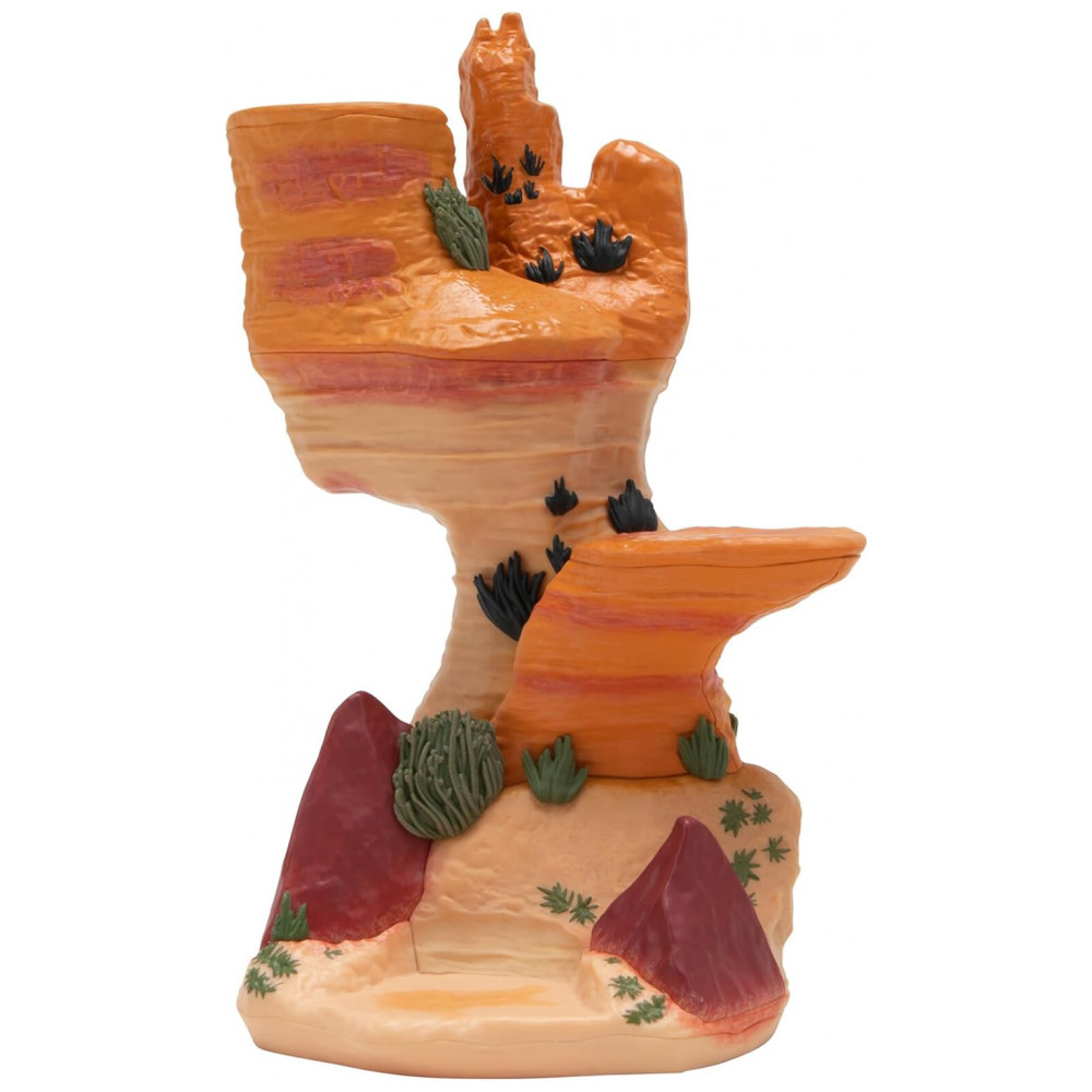 O playset Pokémon Desert Rocks Environment da Jazwares é um cenário de exibição com aproximadamente 15 cm de altura, projetado para recriar um ambiente de deserto em múltiplos níveis para figuras de batalha Pokémon de 5 cm. A estrutura apresenta dois platôs rochosos na parte superior e um caminho de areia na base, formando um diorama estável para posicionamento de personagens.