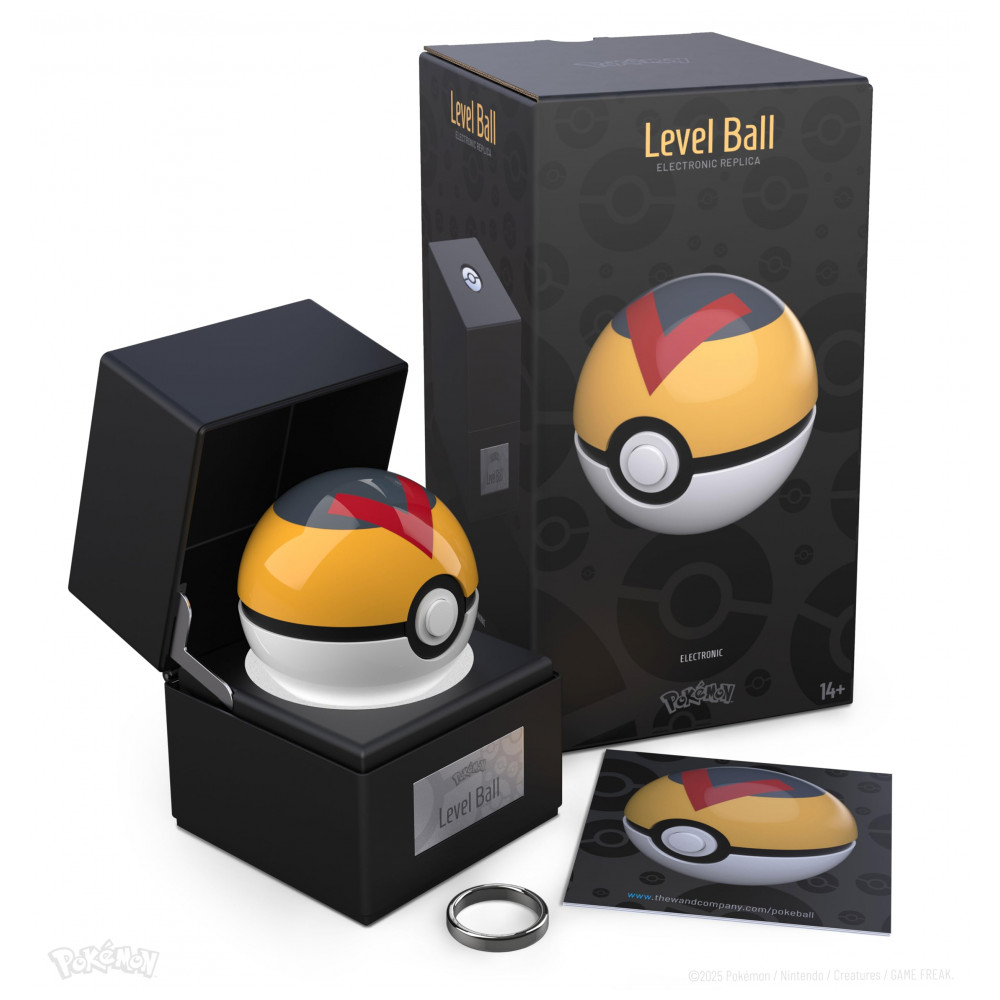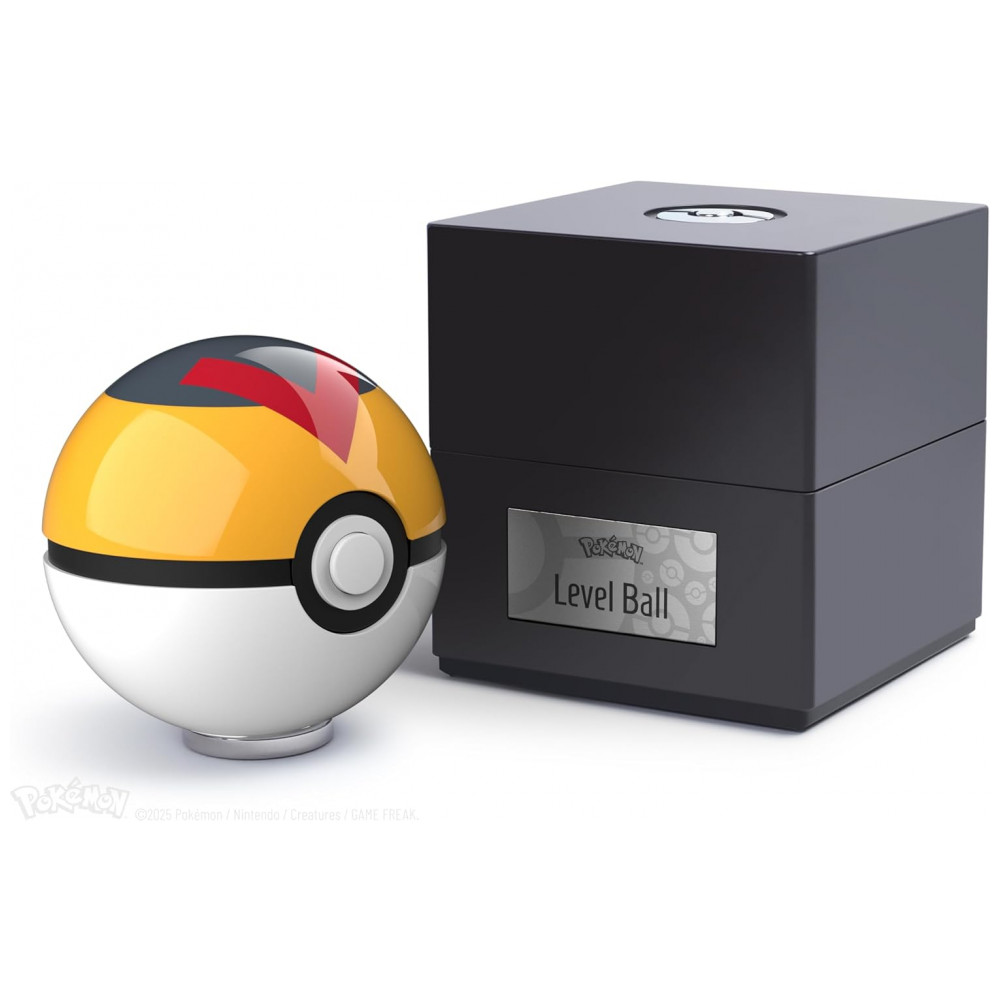 A réplica Poké Bola Level Ball The Wand Company é um modelo eletrônico de exibição com casco metálico usinado, acabamento em pintura colorida de alto brilho e diâmetro aproximado de 7,5 cm. A superfície é sensível a toque e proximidade, proporcionando resposta luminosa no botão frontal quando a esfera é tocada ou aproximada.