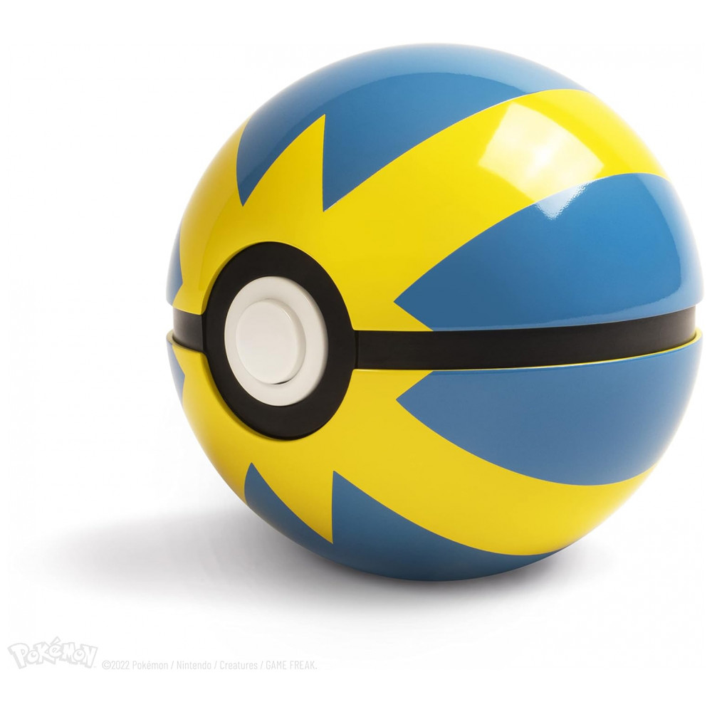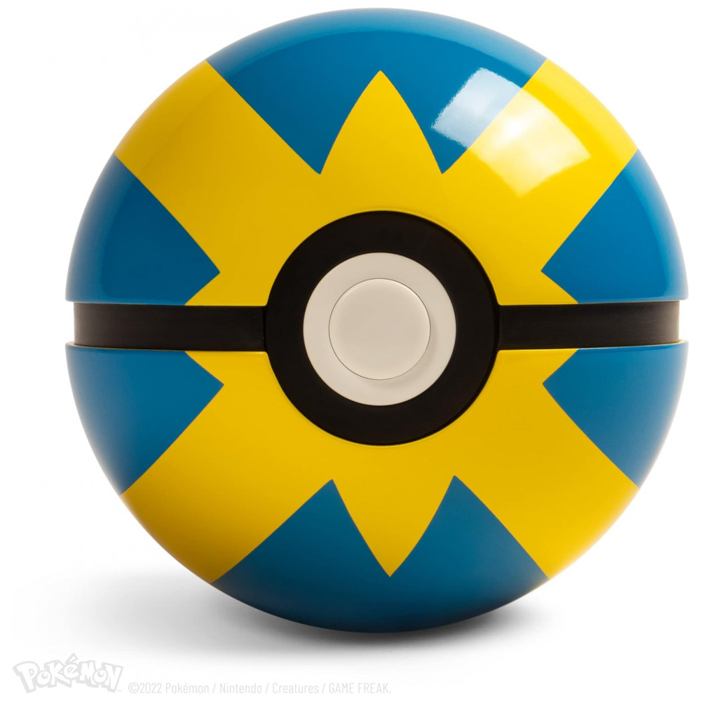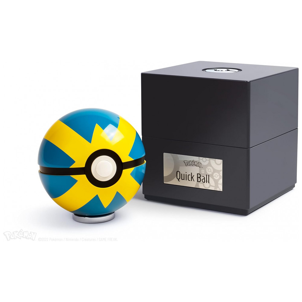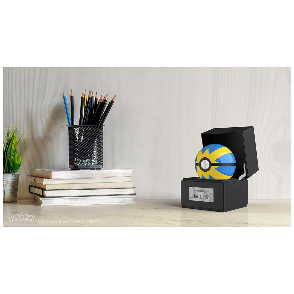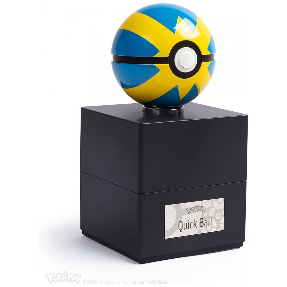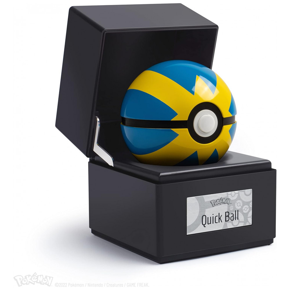 O conjunto inclui base expositora preta com ícone metálico na tampa, que eleva a Quick Ball ao ser aberta e conta com iluminação interna multicolor controlada por toque na placa metálica frontal. A réplica é um item numerado individualmente, licenciado oficialmente pela The Pokémon Company International, voltado para uso como peça de coleção em prateleiras, mesas ou vitrines.