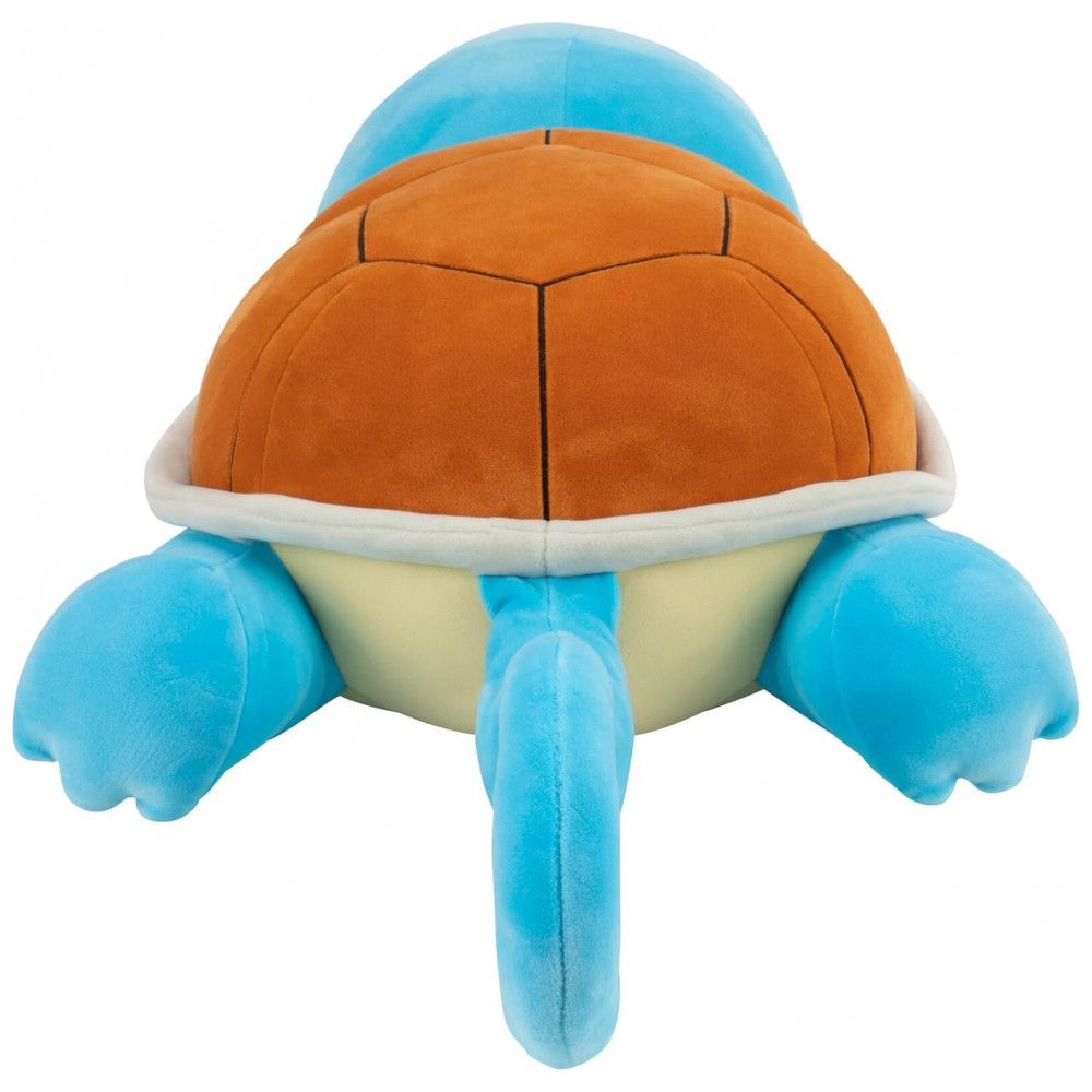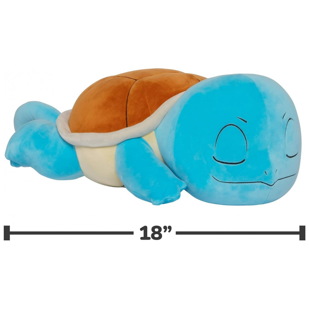A pelúcia Pokémon Squirtle Sleeping Plush foi desenvolvida como boneco de pelúcia em escala ampliada, com aproximadamente 46 cm de comprimento total, pensada para uso decorativo e como travesseiro de apoio leve. O personagem Squirtle é apresentado em pose de sono, com o corpo alongado e a cabeça apoiada lateralmente, mantendo proporções fiéis ao design oficial da franquia.