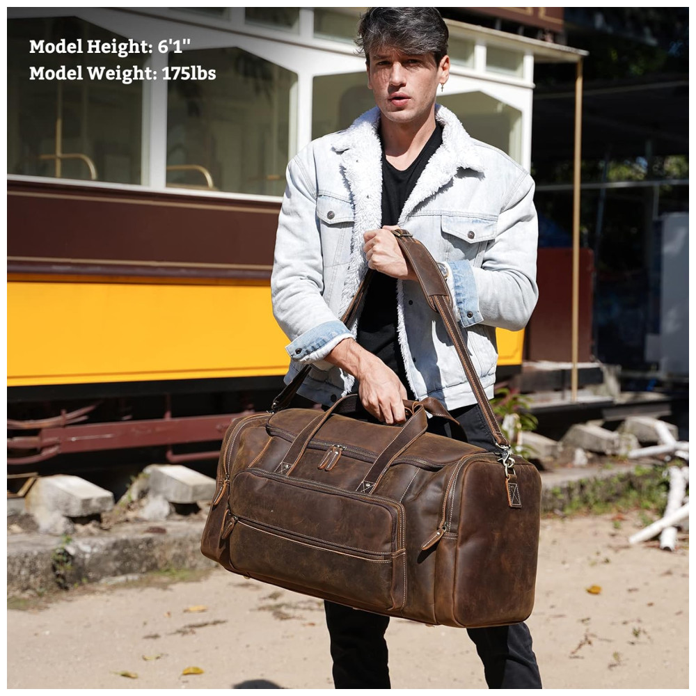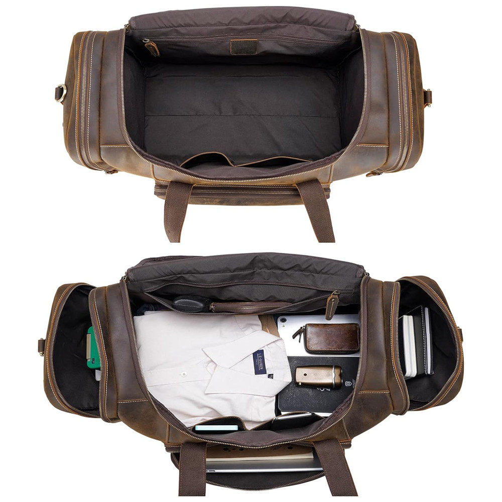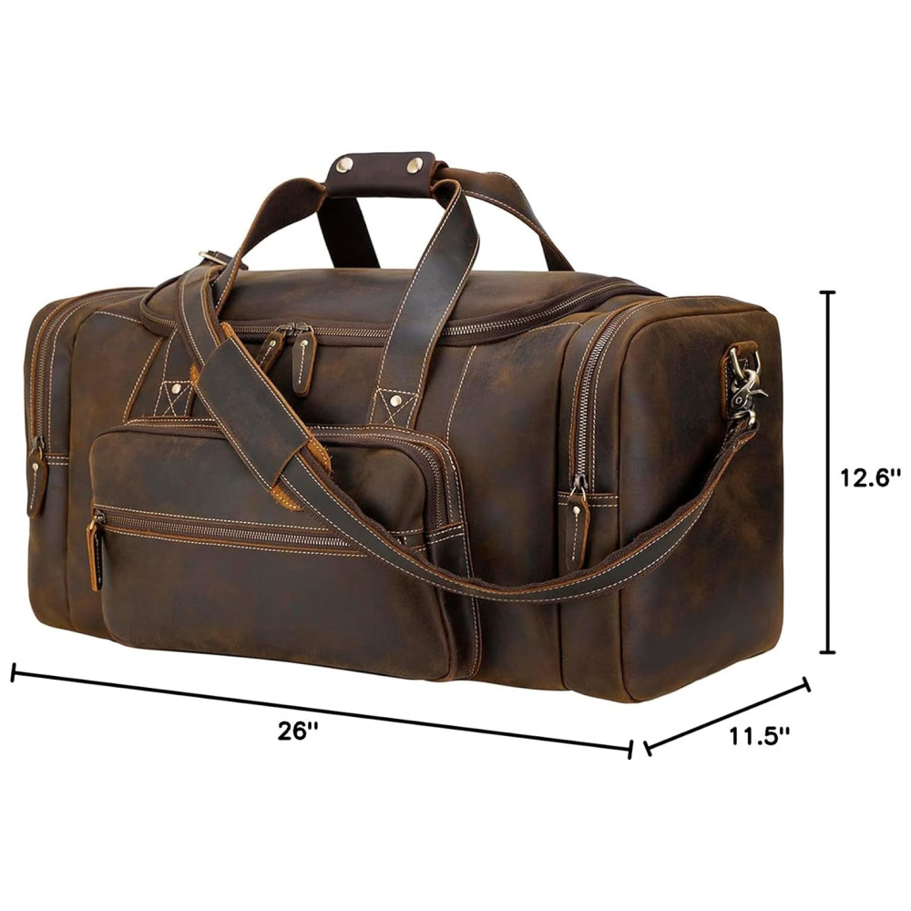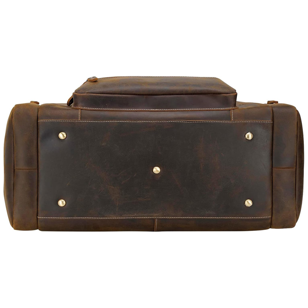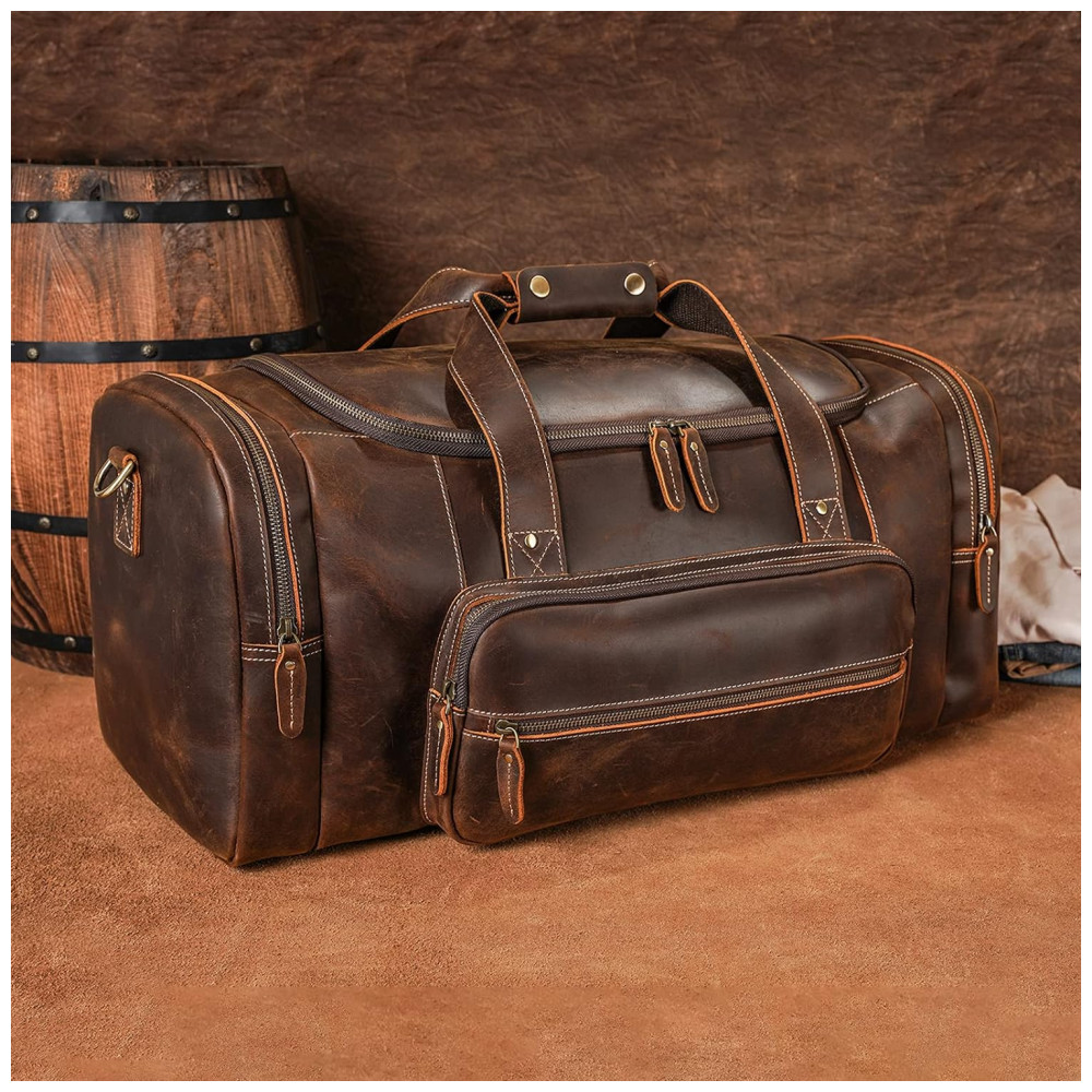 Couro 100 Full Grain Cowhide Usamos couro americano autêntico que ganha personalidade à medida que envelhece. Nossa Weekender Travel Duffel foi feita para enfrentar tudo o que você oferecer ao longo dos anos.