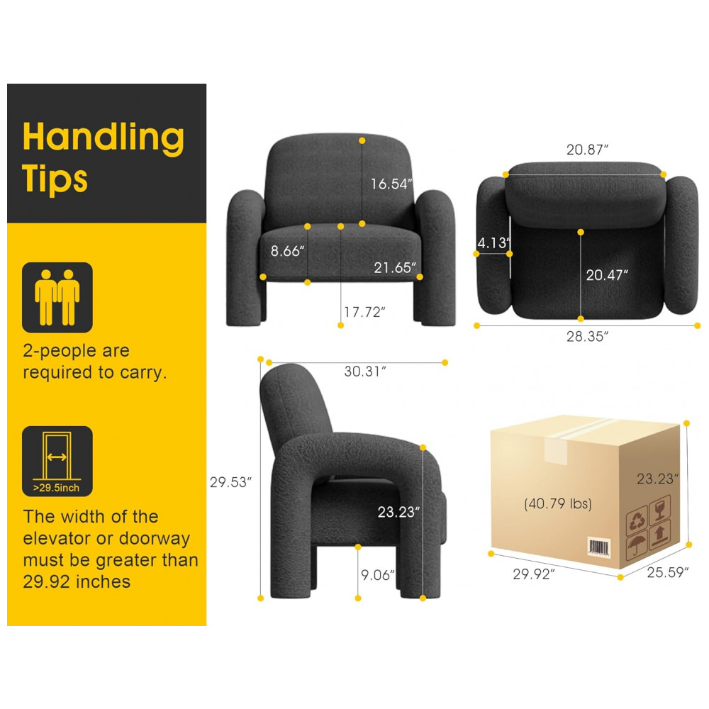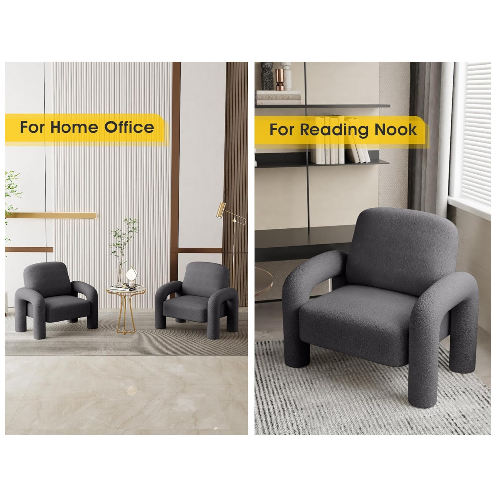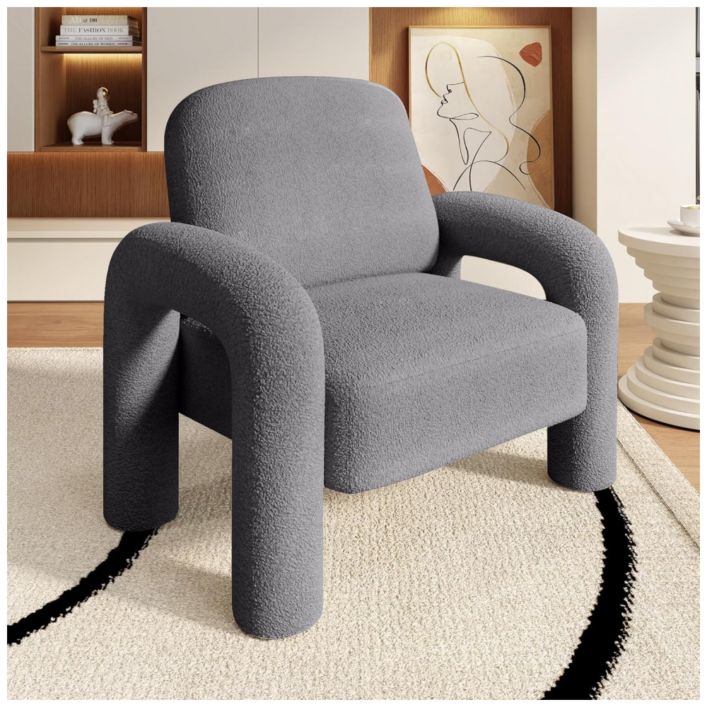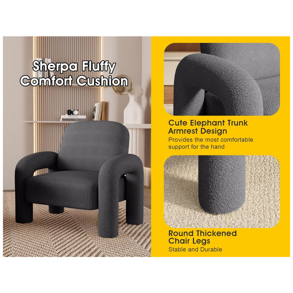 Poltrona Dewhut em tecido sherpa cinza cadeira decorativa estofada com braços curvos tipo tromba de elefante