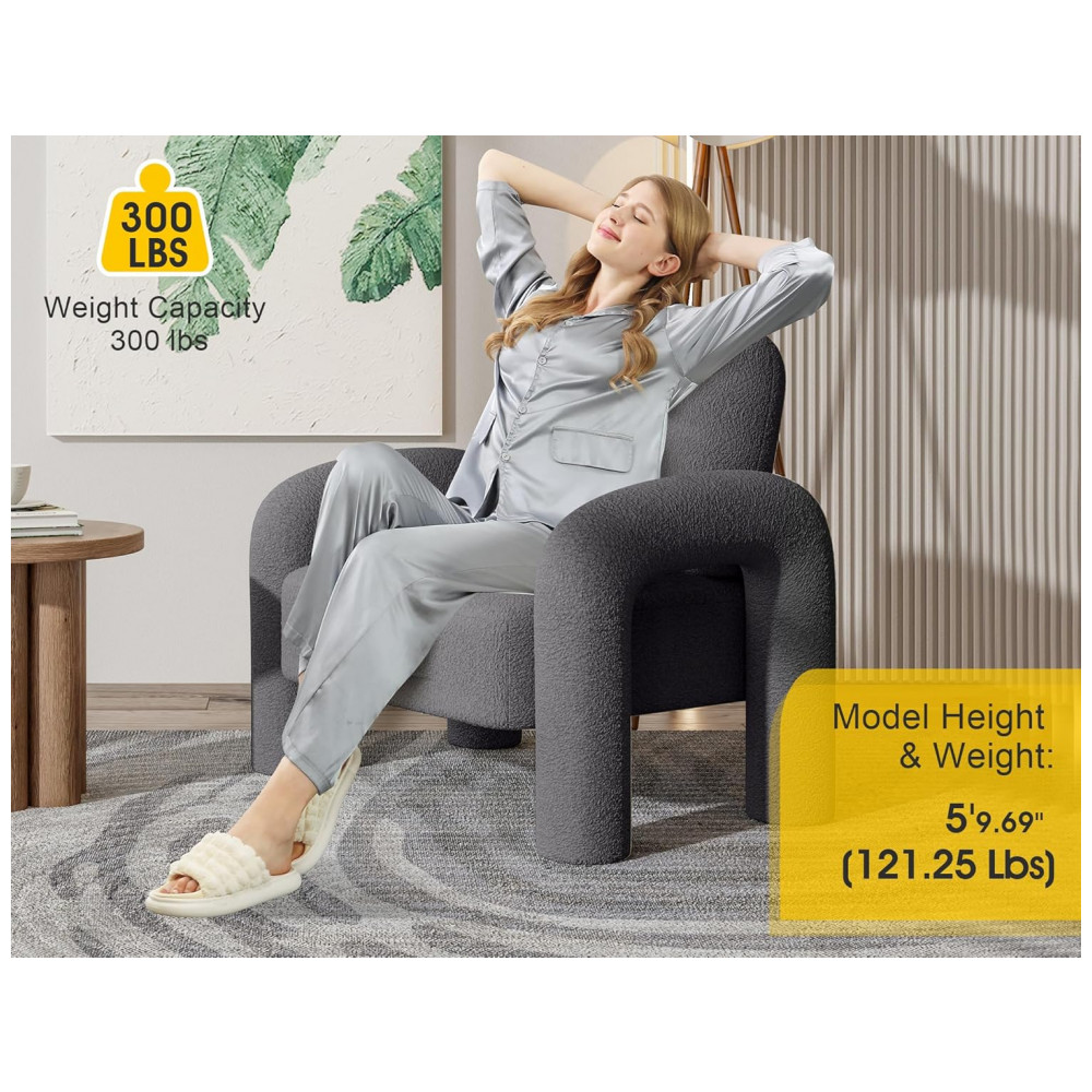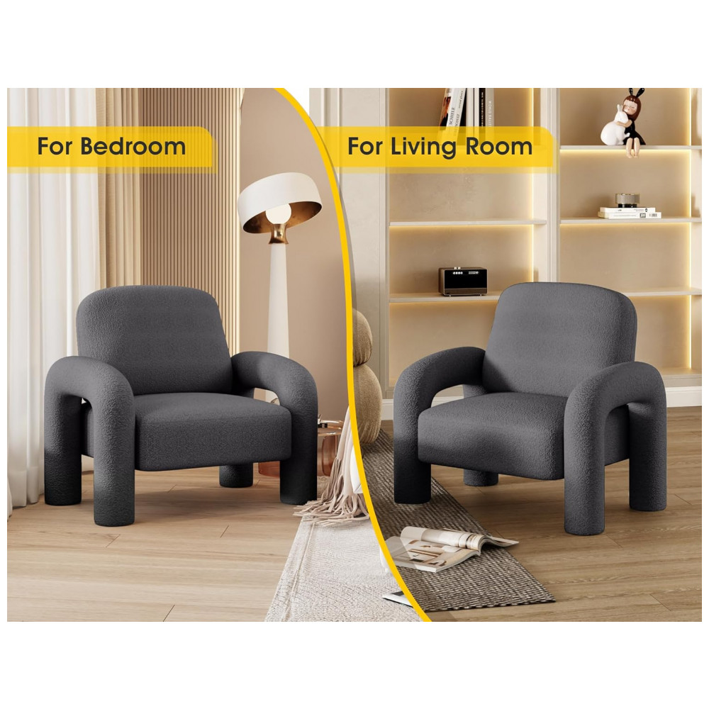 A poltrona Dewhut em tecido sherpa creme é uma cadeira decorativa individual com braços curvos tipo tromba de elefante, assento estofado e encosto acolchoado, indicada para sala de estar, quarto, escritório e cantos de leitura. O revestimento em sherpa proporciona textura fofa e macia ao toque, enquanto a espuma de alta densidade no assento e encosto oferece suporte ao corpo em uso prolongado.