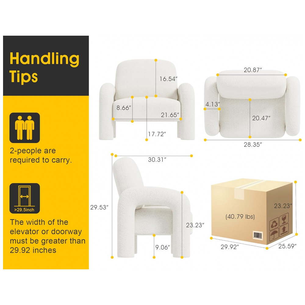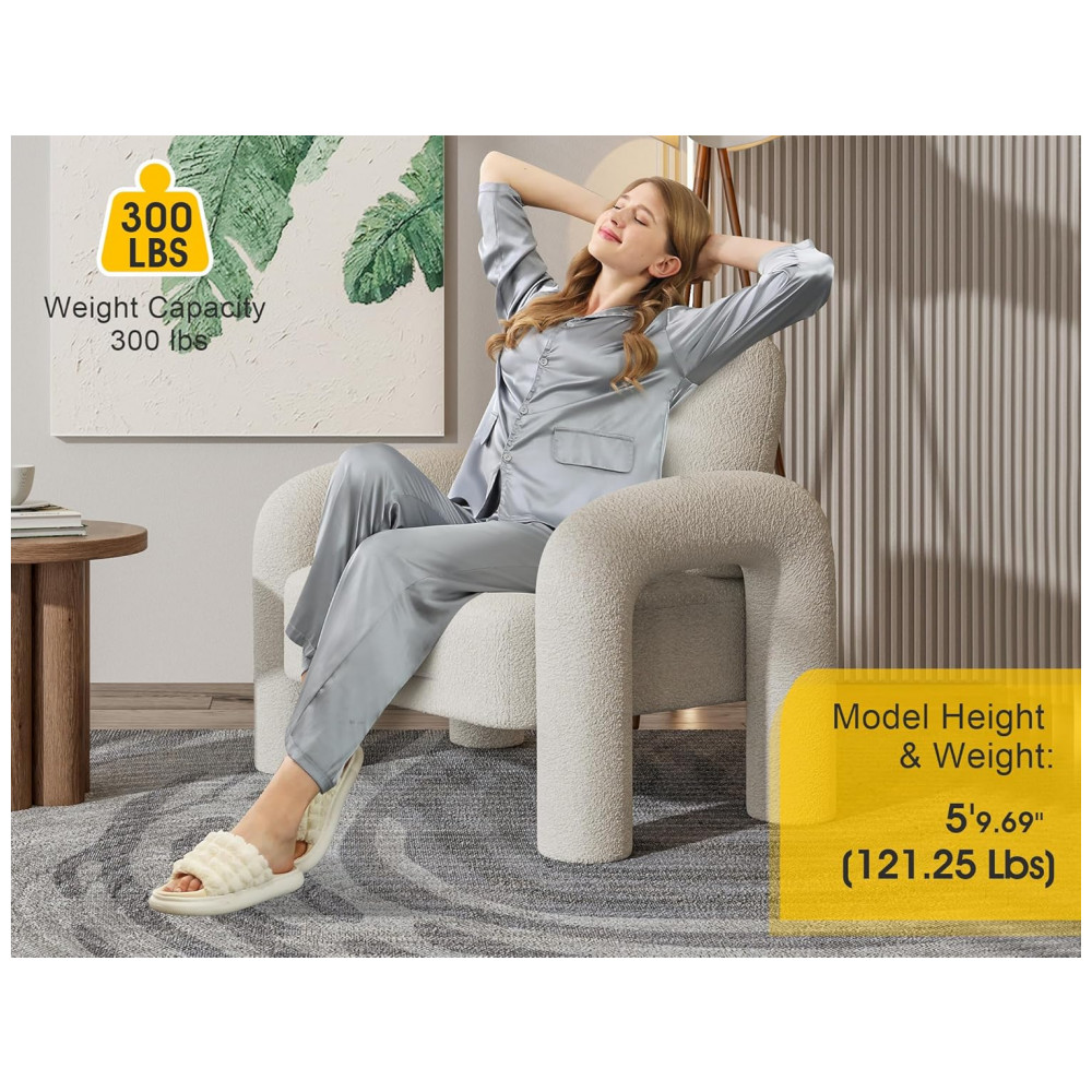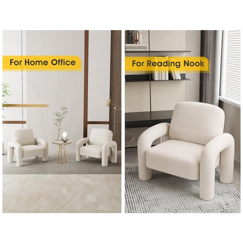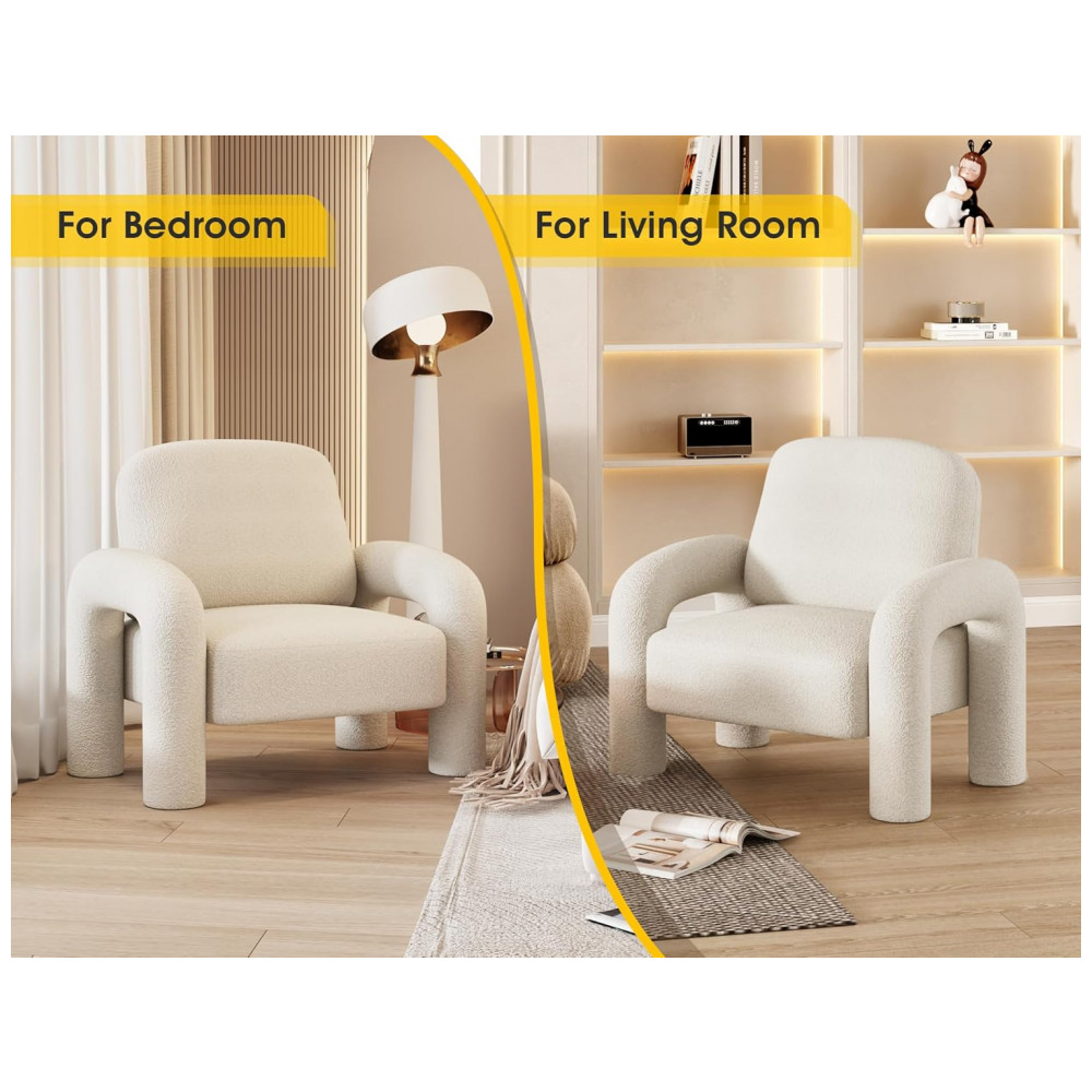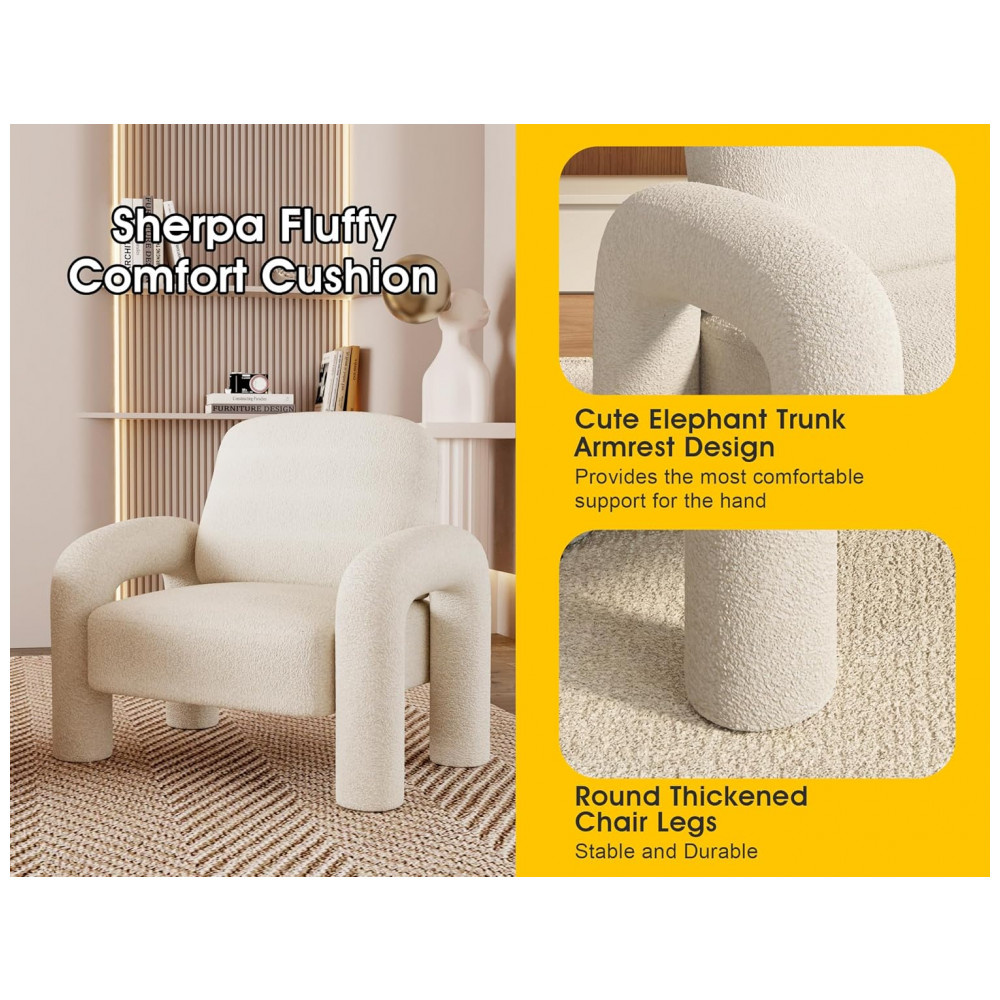 A poltrona Dewhut em tecido sherpa creme é uma cadeira decorativa individual com braços curvos tipo tromba de elefante, assento estofado e encosto acolchoado, indicada para sala de estar, quarto, escritório e cantos de leitura. O revestimento em sherpa proporciona textura fofa e macia ao toque, enquanto a espuma de alta densidade no assento e encosto oferece suporte ao corpo em uso prolongado.