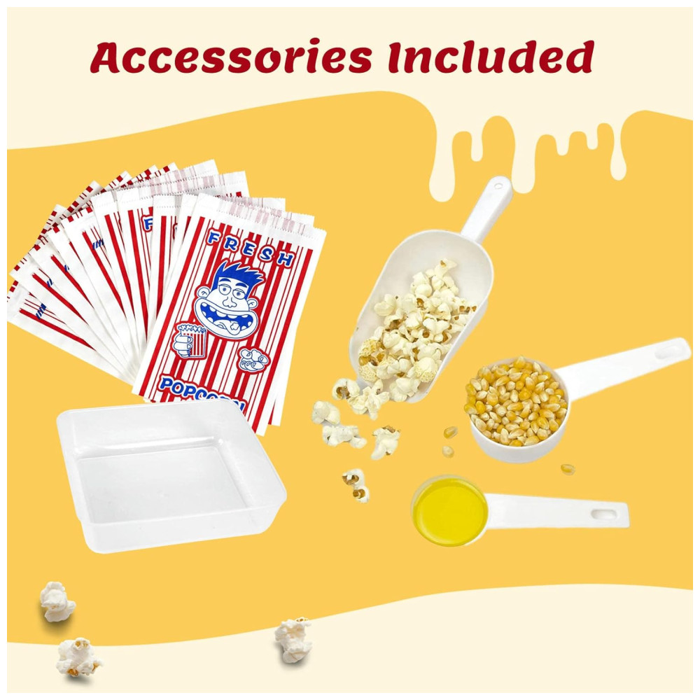 COMBINAÇÃO DE PACOTES E AJUDA AO CLIENTE A máquina de pipoca também vem com 3 colheres de medida, 10 sacos e 1 bandeja de pipoca de plástico. Estamos aqui para lhe oferecer apenas produtos da melhor qualidade. Por favor, não hesite em nos contatar com qualquer dúvida sobre o produto