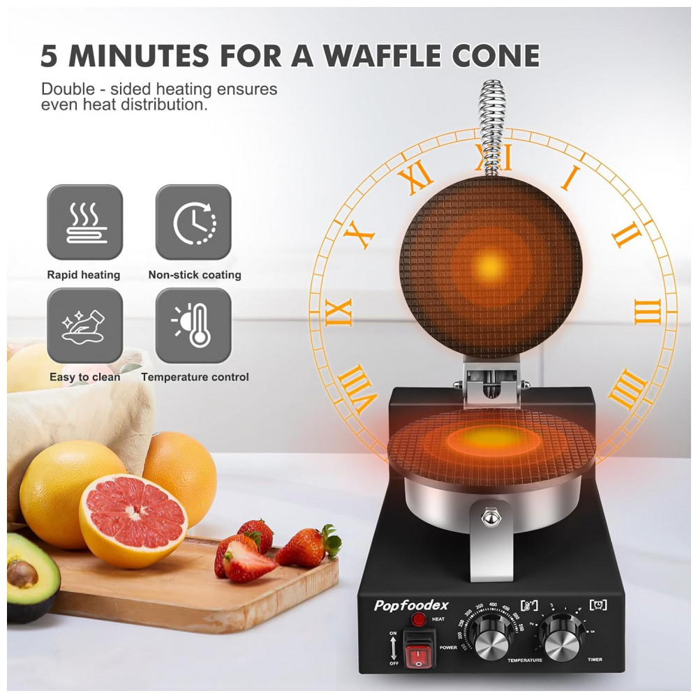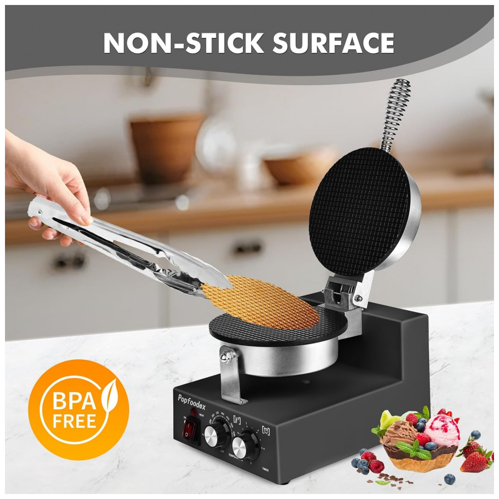 Máquina para Casquinha de Sorvete Comercial POPFOODEX Preto Placa Antiaderente 20 cm 1200W 120V