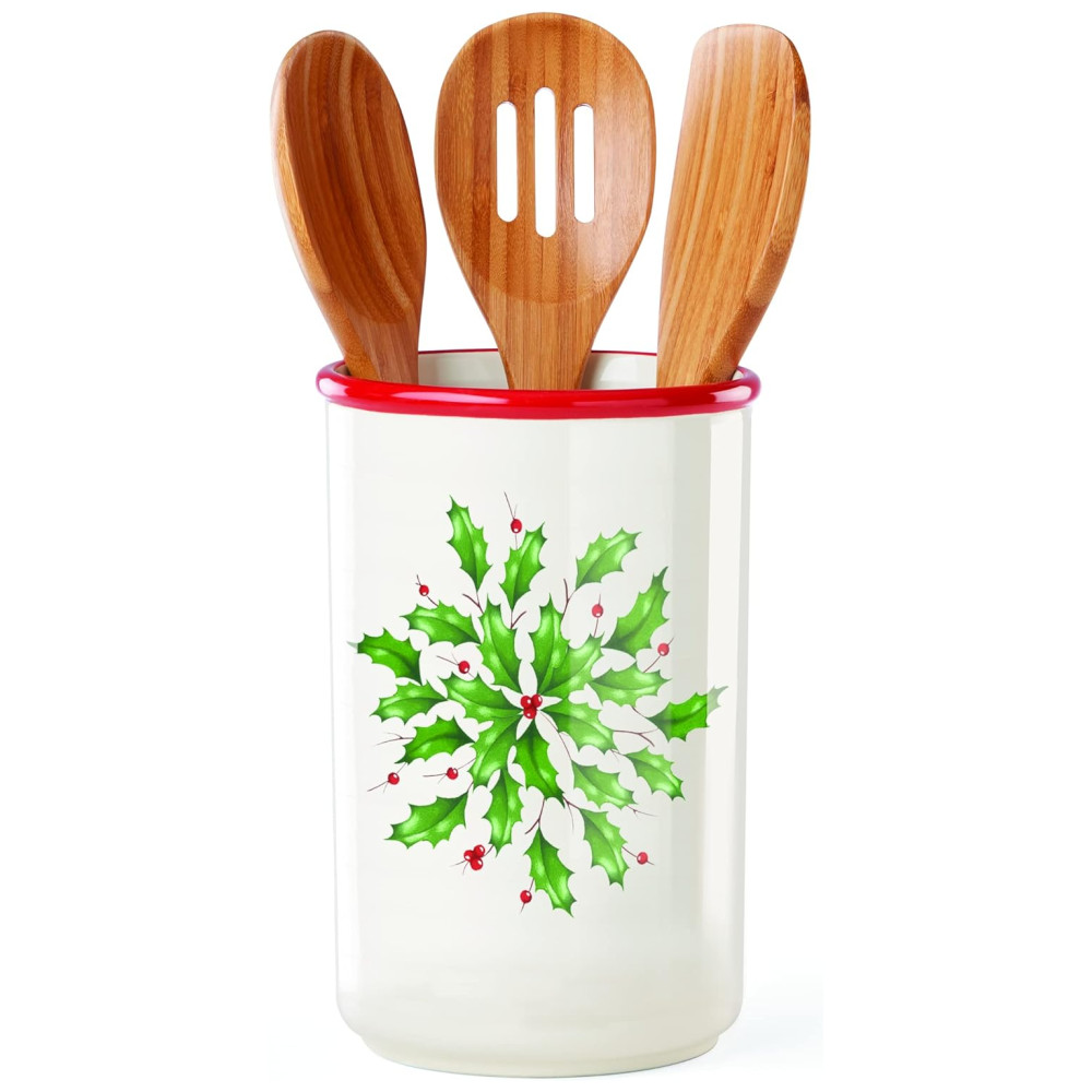 Este conjunto de porta utensílios é decorado com a estampa de azevinho e frutas vermelhas, sendo feito de grés resistente a lascas. A Lenox, empresa com mais de 130 anos de história, tem como objetivo tornar os momentos diários especiais por meio de seus produtos. Cada peça é criada com o compromisso centenário com qualidade, arte e beleza. Este conjunto é feito de faiança e deve ser lavado à mão.